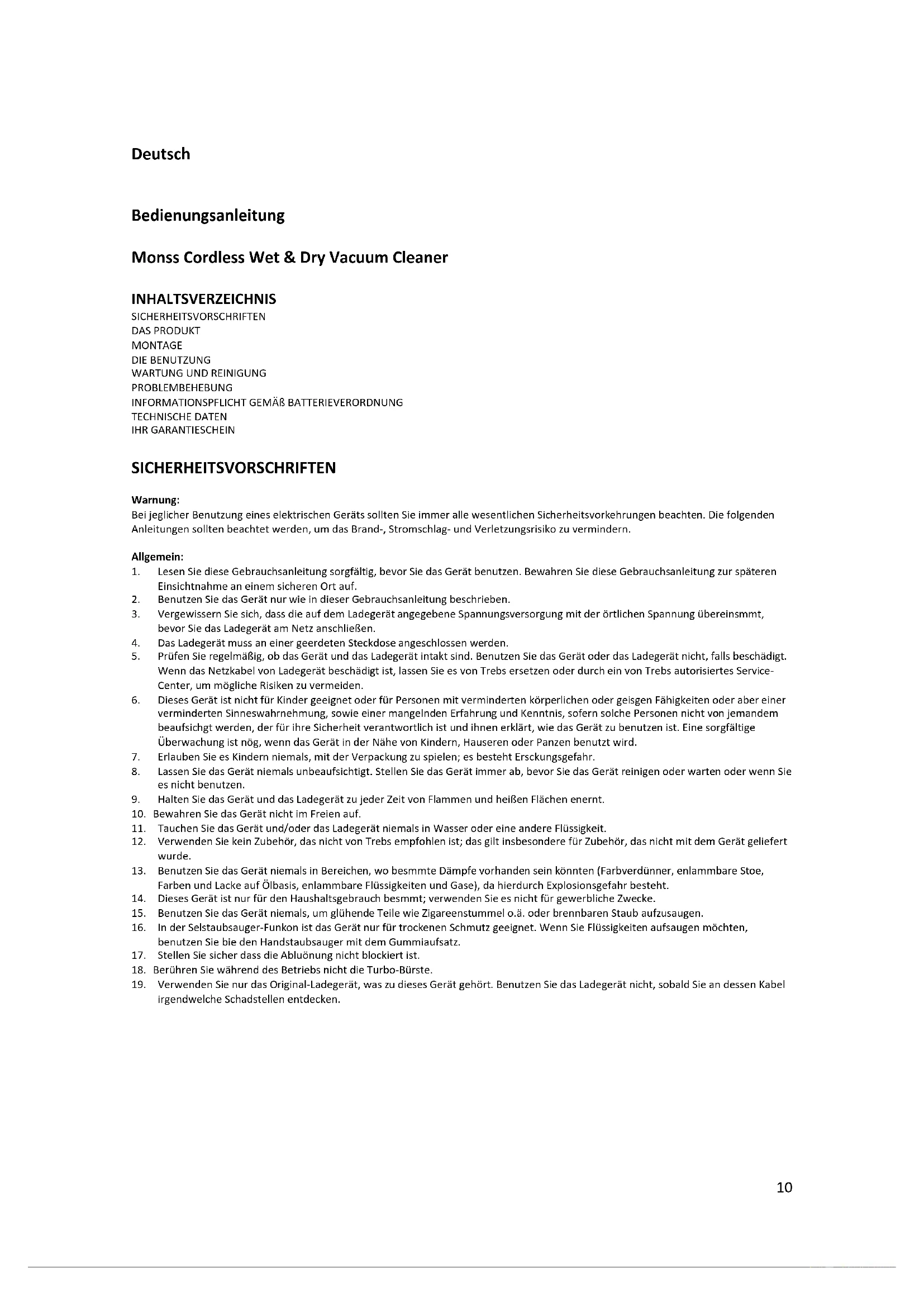 5. Prüfen Sie regelmäßig, ob das Gerät und das Ladegerät intakt sind. Benutzen Sie das Gerät oder das Ladegerät nicht, falls beschädigt. Wenn das Netzkabel von Ladegerät beschädigt ist, lassen Sie es von Trebs ersetzen oder durch ein von Trebs autorisiertes Service- Center, um mögliche Risiken zu vermeiden. 6. Dieses Gerät ist nicht für Kinder geeignet oder für Personen mit verminderten körperlichen oder geistigen Fähigkeiten oder aber einer verminderten Sinneswahrnehmung, sowie einer mangelnden Erfahrung und Kenntnis, sofern solche Personen nicht von jemandem beaufsichtigt werden, der für ihre Sicherheit verantwortlich ist und ihnen erklärt, wie das Gerät zu benutzen ist. Eine sorgfältige Überwachung ist nötig, wenn das Gerät in der Nähe von Kindern, Haustieren oder Pflanzen benutzt wird.