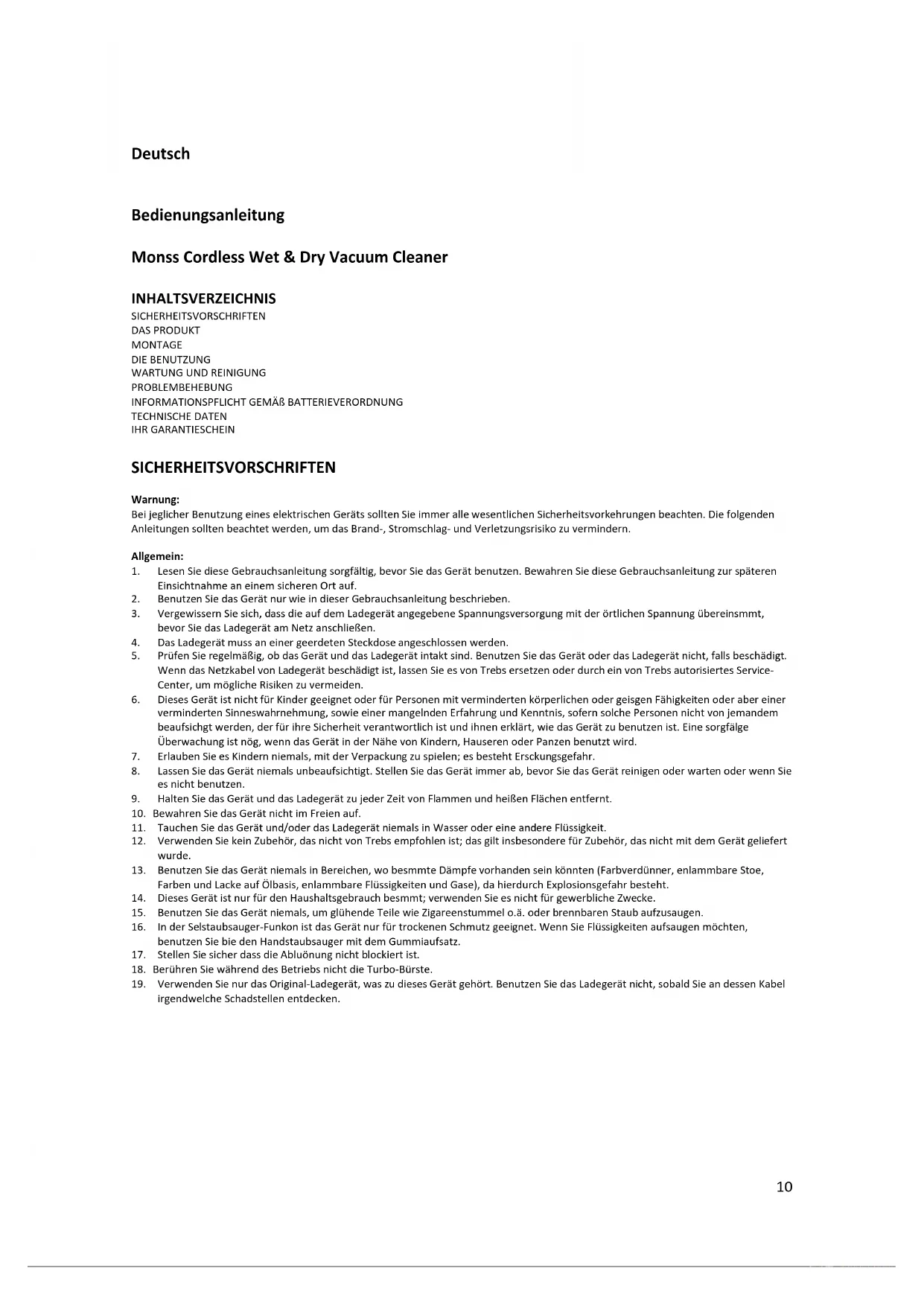 PROBLEMBEHEBUNG INFORMATIONSPFLICHT GEMÄß BATTERIEVERORDNUNG TECHNISCHE DATEN IHR GARANTIESCHEIN SICHERHEITSVORSCHRIFTEN Warnung: Bei jeglicher Benutzung eines elektrischen Geräts sollten Sie immer alle wesentlichen Sicherheitsvorkehrungen beachten. Die folgenden Anleitungen sollten beachtet werden, um das Brand-, Stromschlag- und Verletzungsrisiko zu vermindern. Allgemein: 1. Lesen Sie diese Gebrauchsanleitung sorgfältig, bevor Sie das Gerät benutzen. Bewahren Sie diese Gebrauchsanleitung zur späteren Einsichtnahme an einem sicheren Ort auf.
