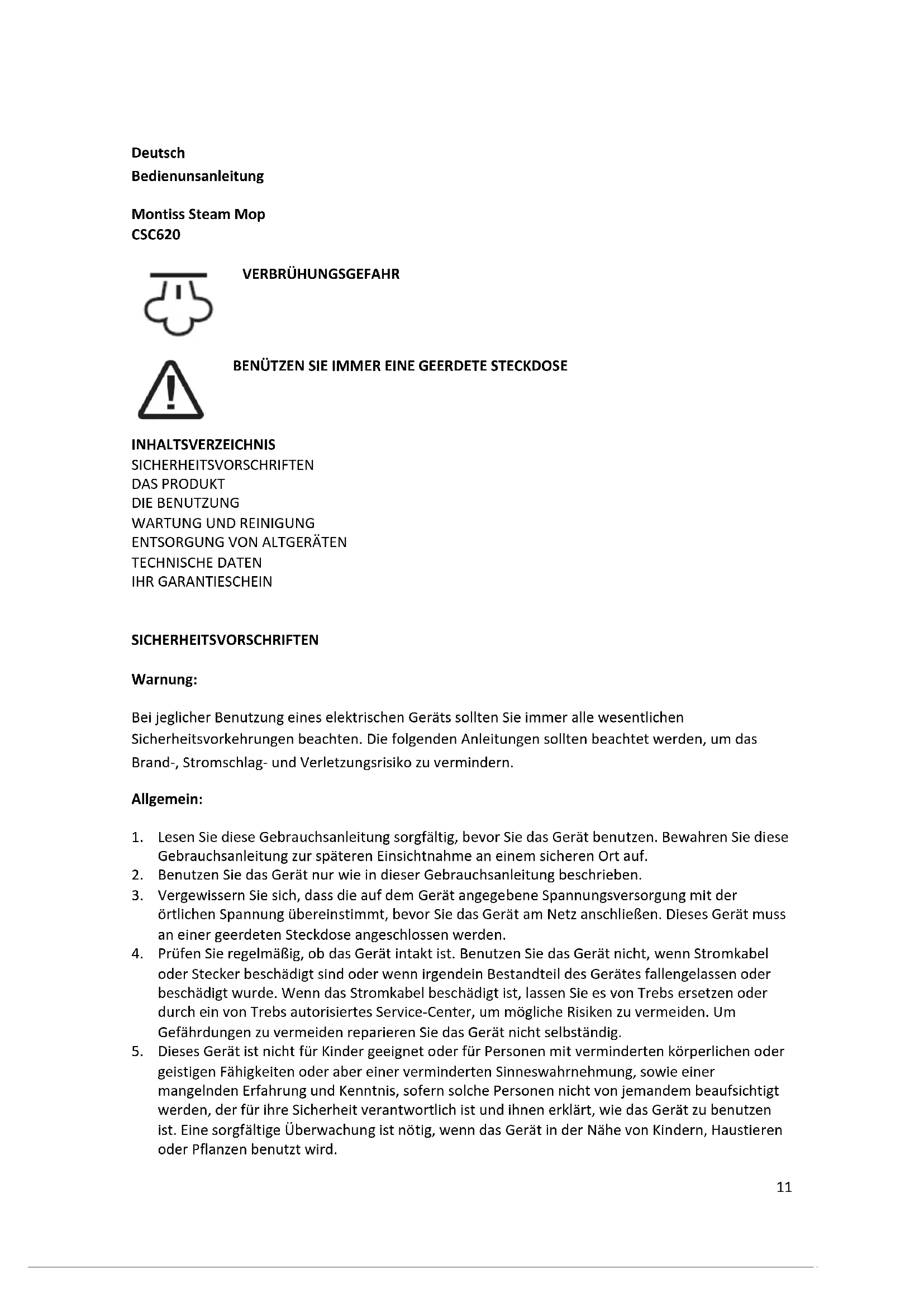 TECHNISCHE DATEN Modelnummer CSC620 Leistung 1.300W Nominale Spannung 220- 240 V Nominale Frequenz 50 Hz Montiss Cleaning Solutions, made under supervision of Trebs Thermiekstraat 1a 6361 HB Nuth Niederlande www.trebs.nl18 IHR GARANTIESCHEIN Dieser Garantieschein deckt Ihr Gerät innerhalb eines Zeitraums von 24 Monaten ab dem Datum des Ankaufs bezüglich Defekten an dem Gerät unter der Voraussetzung ab, dass Sie das Gerät in korrekter Weise benutzt haben, wie es in der Gebrauchsanleitung beschrieben steht. Mängel, die durch unsachgemäße Behandlung, Beschädigung oder Reparaturversuche von Dritten auftreten, fallen nicht unter die Garantie. Die Garantie gilt nicht für das mitgelieferte Zubehör und andere Teile des Geräts, die der Abnutzung unterliegen. Ihre diesbezügliche evtl. Nachbestellung können Sie an www.trebs.nl richten. Dieses Gerät ist ausschließlich für die Nutzung im Haushalt bestimmt. Schäden und/oder Störungen aufgrund betriebsmäßiger Nutzung werden von der Garantie ausgeschlossen. Sie können sich auf die Garantie berufen, wenn:
