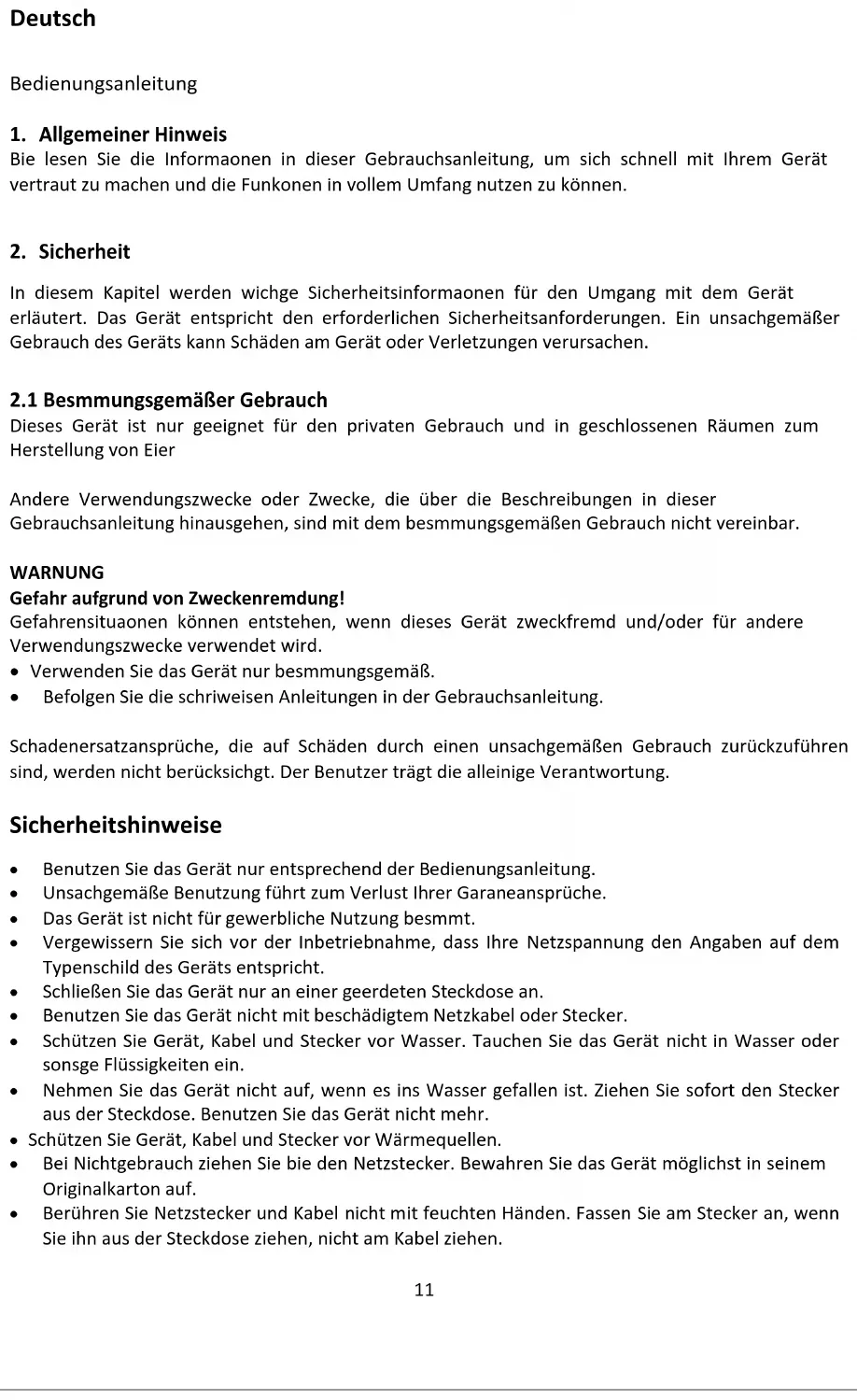 Dieses Gerät ist nur geeignet für den privaten Gebrauch und in geschlossenen Räumen zum Herstellung von Eier Andere Verwendungszwecke oder Zwecke, die über die Beschreibungen in dieser Gebrauchsanleitung hinausgehen, sind mit dem bestimmungsgemäßen Gebrauch nicht vereinbar. WARNUNG Gefahr aufgrund von Zweckentfremdung! Gefahrensituationen können entstehen, wenn dieses Gerät zweckfremd und/oder für andere Verwendungszwecke verwendet wird. Verwenden Sie das Gerät nur bestimmungsgemäß. Befolgen Sie die schrittweisen Anleitungen in der Gebrauchsanleitung. Schadenersatzansprüche, die auf Schäden durch einen unsachgemäßen Gebrauch zurückzuführen sind, werden nicht berücksichtigt. Der Benutzer trägt die alleinige Verantwortung. Sicherheitshinweise Benutzen Sie das Gerät nur entsprechend der Bedienungsanleitung. Unsachgemäße Benutzung führt zum Verlust Ihrer Garantieansprüche. Das Gerät ist nicht für gewerbliche Nutzung bestimmt. Vergewissern Sie sich vor der Inbetriebnahme, dass Ihre Netzspannung den Angaben auf dem Typenschild des Geräts entspricht. Schließen Sie das Gerät nur an einer geerdeten Steckdose an. Benutzen Sie das Gerät nicht mit beschädigtem Netzkabel oder Stecker. Schützen Sie Gerät, Kabel und Stecker vor Wasser. Tauchen Sie das Gerät nicht in Wasser oder sonstige Flüssigkeiten ein. Nehmen Sie das Gerät nicht auf, wenn es ins Wasser gefallen ist. Ziehen Sie sofort den Stecker aus der Steckdose. Benutzen Sie das Gerät nicht mehr. Schützen Sie Gerät, Kabel und Stecker vor Wärmequellen. Bei Nichtgebrauch ziehen Sie bitte den Netzstecker. Bewahren Sie das Gerät möglichst in seinem Originalkarton auf. Berühren Sie Netzstecker und Kabel nicht mit feuchten Händen. Fassen Sie am Stecker an, wenn Sie ihn aus der Steckdose ziehen, nicht am Kabel ziehen.12 Dieses Gerät ist nicht zur Benutzung durch Personen (auch Kinder) mit physischen, sensorischen oder mentalen Beeinträchtigungen oder ohne ausreichender Erfahrung vorgesehen, es sei denn, sie werden durch eine verantwortliche Person beaufsichtigt oder wurden in die ordnungsgemäße Bedienung des Gerätes durch eine für ihre Sicherheit verantwortlichen Person eingewiesen; Benutzen Sie das Gerät nicht in feuchter Umgebung. Benutzen Sie das Gerät nur Drinnen. Halten Sie das Gerät in einem ordnungsgemäßen Zustand, lassen Sie es während des Betriebs nicht unbeaufsichtigt. Stellen Sie das Gerät auf einer festen und ebenen Arbeitsfläche auf. Lassen Sie das Gerät zunächst für 30 Minuten abkühlen, bevor Sie es reinigen oder wegstellen. Setzen Sie das Gerät nicht während des Betriebs um. Reparatur nur durch den autorisierten Kundendienst. Gerätegehäuse nicht öffnen. Falls das Netzkabel beschädigt ist, muss dieses von einem autorisierten Elektriker durch ein spezielles Netzkabel ersetzt werden. Lassen Sie das Netzkabel nicht herunterhängen oder heiße Flächen berühren. Schalten Sie das Gerät aus und ziehen Sie den Stecker aus der Steckdose, wenn bei der Benutzung Störungen auftreten, Sie das Gerät reinigen, Zubehör anbringen oder abnehmen oder Sie das Gerät nicht mehr benutzen. Verwenden Sie das Produkt nur auf einem sauberen, flachen, stabilen und trockenen Untergrund. Zwischen dem Gerät und der Oberfläche dürfen sich keine Objekte wie Tischdecken oder Kunststoffgegenstände befinden. Es besteht Brandgefahr, wenn das Gerät während des Betriebs von Materialien wie Gardinen, Vorhängen, Wänden oder ähnlichem bedeckt wird oder damit in Kontakt kommt. Da dieses Gerät mit Lebensmitteln in Kontakt kommt, ist es absolut wichtig, dass Sie dieses Gerät jederzeit sauber halten. Achten Sie darauf, die Antihaftbeschichtung des Gar Raums nicht zu zerkratzen, da anderenfalls kleine Teilchen dieser Schicht in die Speisen gelangen könnten. Falls Sie etwas abkratzen müssen, trennen Sie das Gerät vom Netzstrom und verwenden Sie nur die mitgelieferte Reinigungsbürste. Das Gerät darf nicht über eine separate Zeitschaltuhr oder eine Fernsteuerung betrieben werden. Dieses Gerät darf nicht mit Verlängerungsschnur verwendet werden.