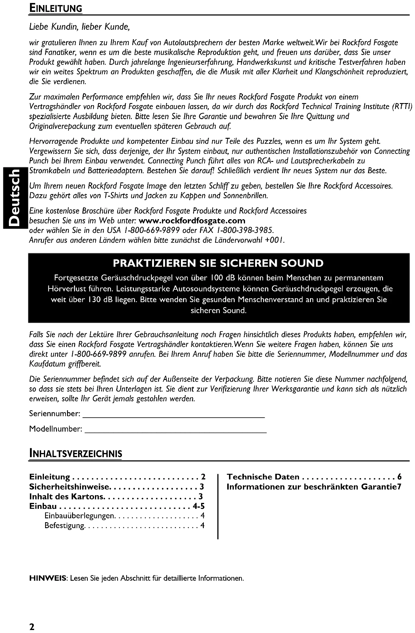 - Fortgesetzte Geräuschdruckpegel von über 100 dB können beim Menschen zu permanentem Hörverlust führen. Leistungsstarke Autosoundsysteme können Geräuschdruckpegel erzeugen, die weit über 130 dB liegen. Bitte wenden Sie gesunden Menschenverstand an und praktizieren Sie sicheren Sound. HINWEIS: Lesen Sie jeden Abschnitt für detaillierte Informationen. Falls Sie nach der Lektüre Ihrer Gebrauchsanleitung noch Fragen hinsichtlich dieses Produkts haben, empfehlen wir, dass Sie einen Rockford Fosgate Vertragshändler kontaktieren.Wenn Sie weitere Fragen haben, können Sie uns direkt unter 1-800-669-9899 anrufen. Bei Ihrem Anruf haben Sie bitte die Seriennummer, Modellnummer und das Kaufdatum griffbereit. Die Seriennummer befindet sich auf der Außenseite der Verpackung. Bitte notieren Sie diese Nummer nachfolgend, so dass sie stets bei Ihren Unterlagen ist. Sie dient zur Verifizierung Ihrer Werksgarantie und kann sich als nützlich erweisen, sollte Ihr Gerät jemals gestohlen werden. Seriennumber: ______________________________________ Modellnumber: ______________________________________ Einleitung p. 2