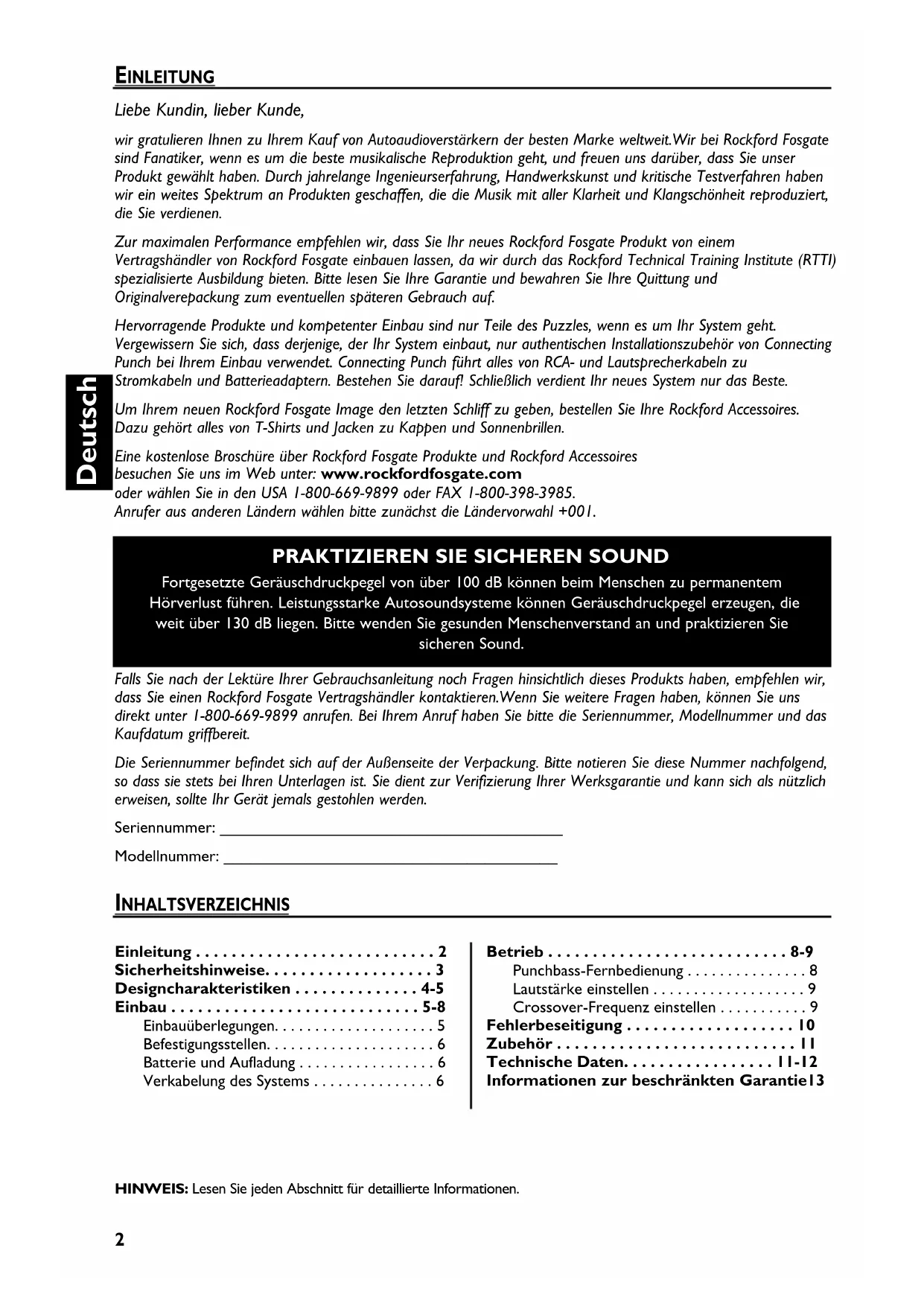 - Fortgesetzte Geräuschdruckpegel von über 100 dB können beim Menschen zu permanentem Hörverlust führen. Leistungsstarke Autosoundsysteme können Geräuschdruckpegel erzeugen, die weit über 130 dB liegen. Bitte wenden Sie gesunden Menschenverstand an und praktizieren Sie sicheren Sound. HINWEIS: Lesen Sie jeden Abschnitt für detaillierte Informationen. Falls Sie nach der Lektüre Ihrer Gebrauchsanleitung noch Fragen hinsichtlich dieses Produkts haben, empfehlen wir, dass Sie einen Rockford Fosgate Vertragshändler kontaktieren.Wenn Sie weitere Fragen haben, können Sie uns direkt unter 1-800-669-9899 anrufen. Bei Ihrem Anruf haben Sie bitte die Seriennummer, Modellnummer und das Kaufdatum griffbereit. Die Seriennummer befindet sich auf der Außenseite der Verpackung. Bitte notieren Sie diese Nummer nachfolgend, so dass sie stets bei Ihren Unterlagen ist. Sie dient zur Verifizierung Ihrer Werksgarantie und kann sich als nützlich erweisen, sollte Ihr Gerät jemals gestohlen werden. Seriennummer: ______________________________________ Modellnummer: _____________________________________ Einleitung p. 2