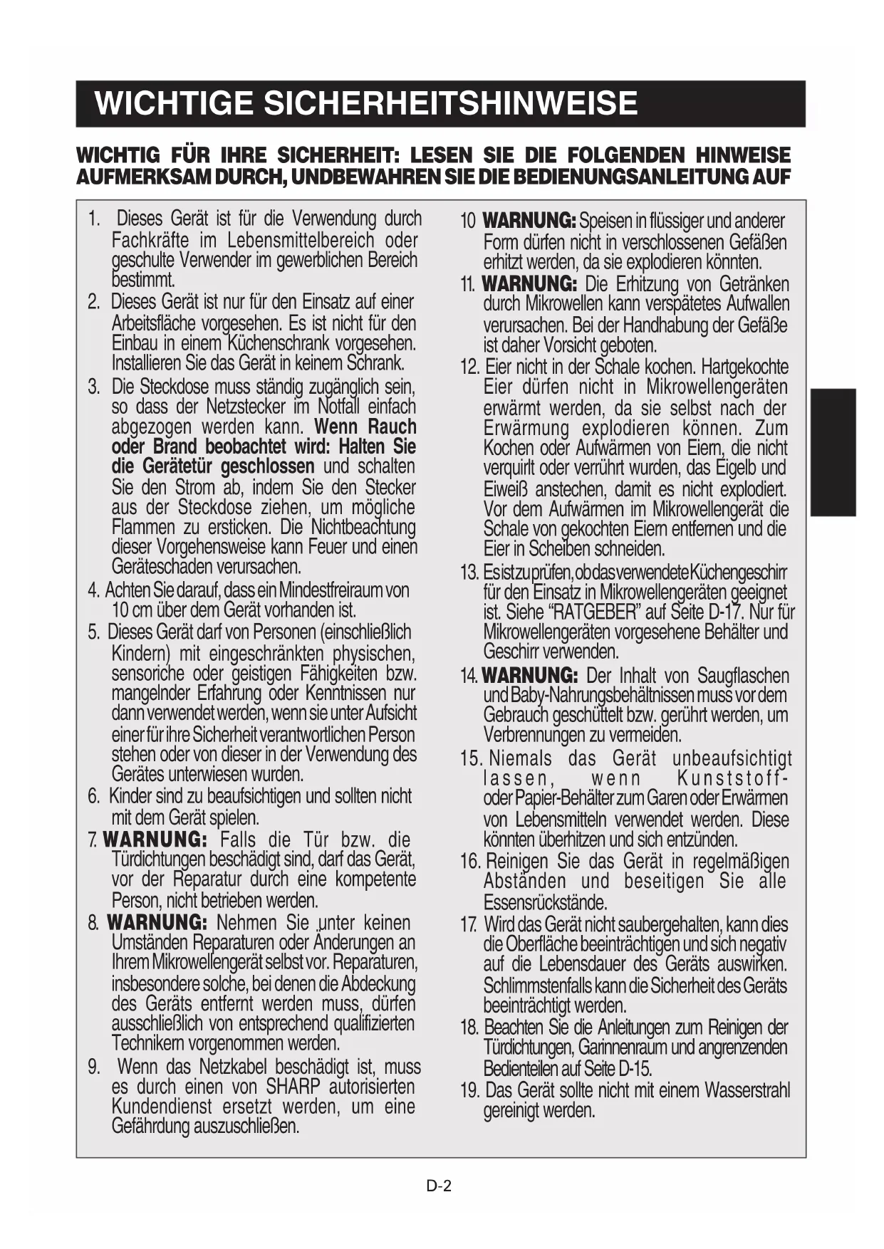 es durch einen von SHARP autorisierten Kundendienst ersetzt werden, um eine Gefährdung auszuschließen. 10 WARNUNG: Speisen in flüssiger und anderer Form dürfen nicht in verschlossenen Gefäßen erhitzt werden, da sie explodieren könnten.