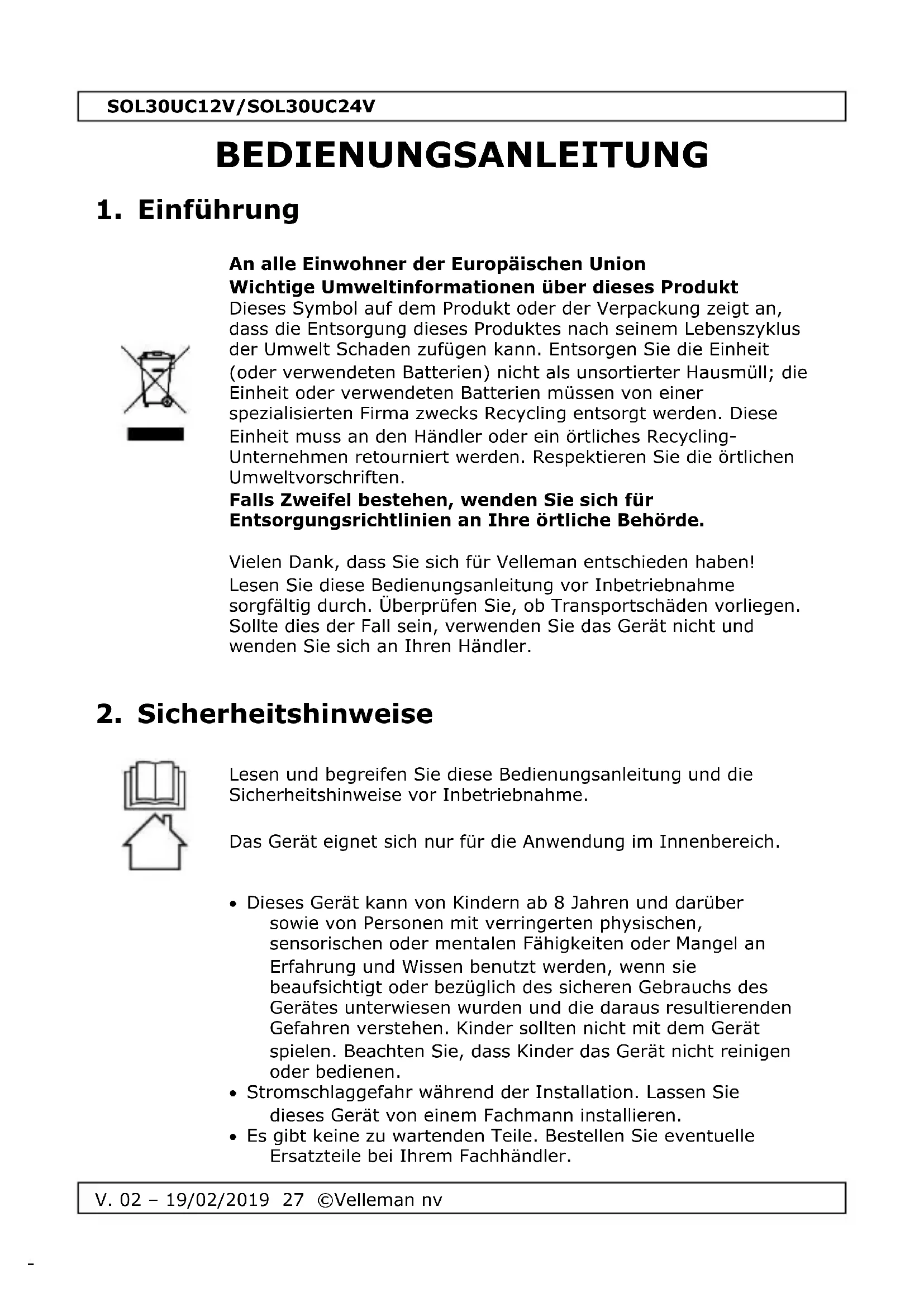 Velleman NV besitzt das Urheberrecht für diese Bedienungsanleitung. Alle weltweiten Rechte vorbehalten. Ohne vorherige schriftliche Genehmigung des Urhebers ist es nicht gestattet, diese Bedienungsanleitung ganz oder in Teilen zu reproduzieren, zu kopieren, zu übersetzen, zu bearbeiten oder zu speichern.SOL30UC12V/SOL30UC24V