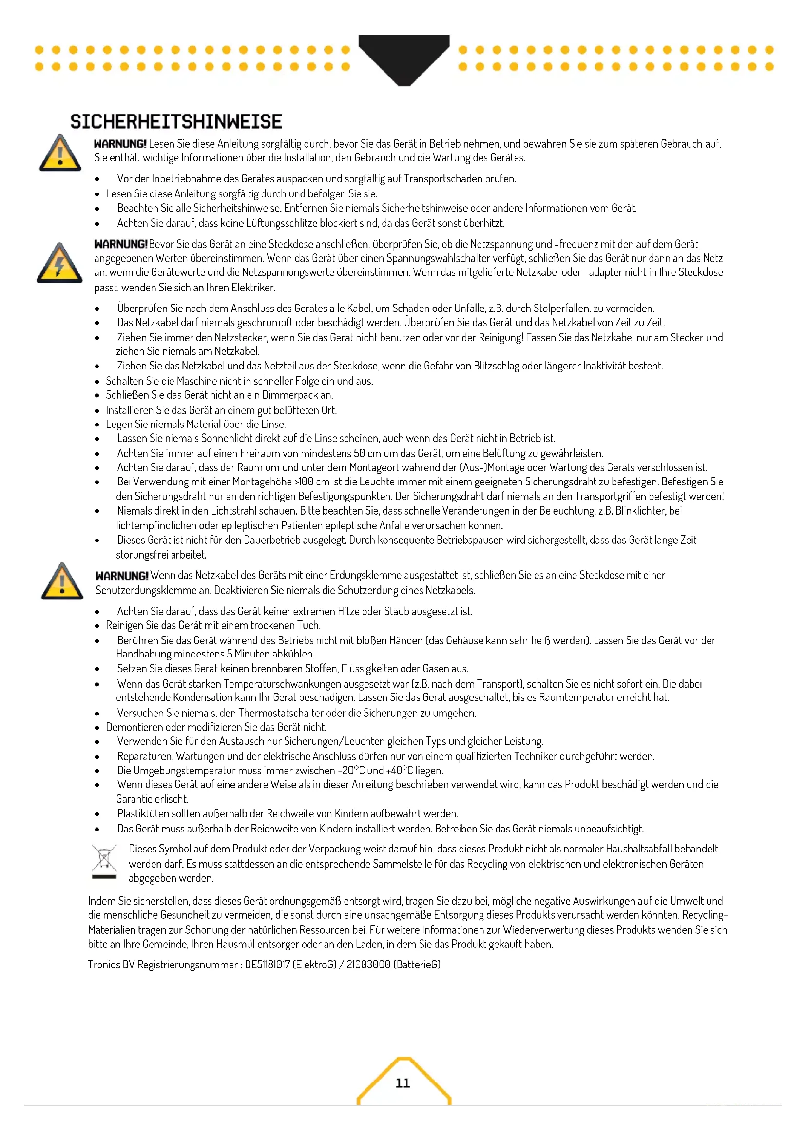 - Das Gerät muss außerhalb der Reichweite von Kindern installiert werden. Betreiben Sie das Gerät niemals unbeaufsichtigt. Dieses Symbol auf dem Produkt oder der Verpackung weist darauf hin, dass dieses Produkt nicht als normaler Haushaltsabfall behandelt werden darf. Es muss stattdessen an die entsprechende Sammelstelle für das Recycling von elektrischen und elektronischen Geräten abgegeben werden. Indem Sie sicherstellen, dass dieses Gerät ordnungsgemäß entsorgt wird, tragen Sie dazu bei, mögliche negative Auswirkungen auf die Umwelt und die menschliche Gesundheit zu vermeiden, die sonst durch eine unsachgemäße Entsorgung dieses Produkts verursacht werden könnten. Recycling- Materialien tragen zur Schonung der natürlichen Ressourcen bei. Für weitere Informationen zur Wiederverwertung dieses Produkts wenden Sie sich bitte an Ihre Gemeinde, Ihren Hausmüllentsorger oder an den Laden, in dem Sie das Produkt gekauft haben. Tronios BV Registrierungsnummer : DE51181017 (ElektroG) / 21003000 (BatterieG)Packen Sie den Karton sofort nach Erhalt sorgfältig aus, überprüfen Sie seinen Inhalt, um sicherzustellen, dass alle Teile vorhanden sind und in gutem Zustand erhalten wurden. Bei Transportschäden oder fehlenden Teilen ist der Verkäufer unverzüglich zu informieren. Lagern Sie die Verpackung und das Verpackungsmaterial. Wenn das Produkt zurückgegeben werden muss, ist es wichtig, dass das Produkt in der Originalverpackung zurückgegeben wird. Wenn das Gerät drastischen Temperaturunterschieden ausgesetzt war (z.B. nach dem Transport), schalten Sie es nicht sofort ein. Die dabei entstehende Kondensation kann das Gerät beschädigen. Vergewissern Sie sich, dass das Gerät Raumtemperatur hat, und stecken Sie dann den Netzstecker in die Steckdose. Auf der Rückseite von das Gerät wird angezeigt, an welche Netzspannung es angeschlossen werden muss. Prüfen Sie, ob die Netzspannung mit dieser übereinstimmt. Wenn die Netzspannung von der angegebenen abweicht, kann das Gerät irreparabel beschädigt werden. Das Gerät muss auch direkt an die Netzspannung angeschlossen werden. Es darf kein Dimmer oder eine einstellbare Stromversorgung verwendet werden. Das Gerät verfügt über einen powerconnector Netzausgang. Entsprechend der örtlichen Gegebenheiten können mehrere Geräte durch powerconnector Ein- und Ausgang verlinkt werden. Verbinden Sie maximal vier (bei Benutzung von 230V/16A) P12 in einer Reihe. Nutzen Sie dafür ein zugelassenes dreiadriges Kabel mit min. 1,5 mm² Querschnitt. Dabei sind die Installationshinweise vom Hersteller und die Farbkodierung des Kabels zu beachten. Schalten Sie das Gerät nicht durch Drehen des powerconnector aus, sondern verwenden Sie den Ein-/Ausschalter oder ziehen Sie den Netzstecker! Schließen Sie das Gerät immer an einen geschützten Stromkreis an (Fehlerstromschutzschalter oder Sicherung). Vergewissern Sie sich, dass das Gerät ausreichend elektrisch geerdet ist, um die Gefahr eines Stromschlags oder Brandes zu vermeiden. Für kurzzeitige Installationen können Sie das Gerät mit einer für das Gewicht des Geräts zugelassenen Traversenklemme, die durch das Loch in der Mitte der Halterung (A) sicher befestigt wird, an einer Traverse aufhängen. Das Gerät darf nur senkrecht nach unten aufgehängt werden. Wenn eine Traversenklemme verwendet wird, muss das Gerät mit einem für das Gewicht des Geräts zugelassenen Sicherungsseil gesichert werden, damit das Sicherungsseil das Gerät tragen kann, wenn die Traversenklemme versagt. Entfernen Sie so viel Lose wie möglich vom Sicherheitskabel (z. B. indem Sie es mehrmals um das Traversenrohr führen). Prüfen Sie, ob die Traverse und alle verwendeten Befestigungselemente das 10-fache Gewicht aller Einbauten und Geräte tragen können, die sie tragen sollen. Befolgen Sie bei der Durchführung einer Installation immer die europäischen und nationalen Richtlinien bezüglich Rigging, Traversen und allen anderen Sicherheitsaspekten. Lassen Sie die Installation immer von einem autorisierten Fachhändler prüfen! Verwenden Sie zur Verankerung der Montagehalterung an einer Wand oder einer anderen ebenen Fläche drei hochfeste, korrosionsbeständige und für die Anwendung sichere Befestigungselemente. Verwenden Sie selbstsichernde Muttern! Bringen Sie Unterlegscheiben unter allen Muttern und Schraubenköpfen an. Achten Sie darauf, dass sich zwischen jedem Befestigungselement und der Halterung eine Unterlegscheibe befindet. Stellen Sie sicher, dass die Oberfläche und alle verwendeten Befestigungselemente das 10-fache Gewicht aller Befestigungselemente und Geräte, die sie tragen sollen, tragen können. Befestigen Sie die Mitte der Halterung mit einer Schraube mit 10 mm Schaftdurchmesser im Mittelloch A. Verwenden Sie dann zwei Schrauben mit 8 mm Schaftdurchmesser, die durch die gebogenen Schlitze B gehen, um die Halterung zu verankern. Diese Anordnung ermöglicht eine Schwenkverstellung von ca. 90°.Wenn Sie einen Standard-DMX-Controller verwenden, können Sie den DMX-Ausgang des Controller direkt mit dem DMX-Eingang des ersten Geräts verbinden. Verbinden Sie den DMX-Ausgang immer mit dem nächsten DMX-Eingang des nächsten Geräts, bis alle Geräte angeschlossen sind.