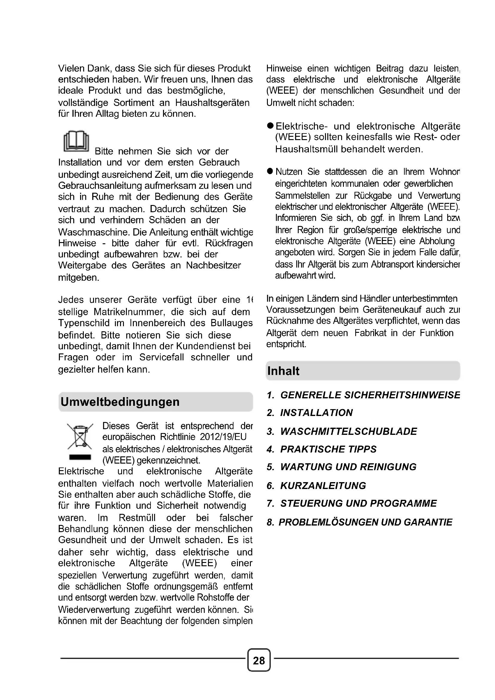 Vielen Dank, dass Sie sich für dieses Produkt entschieden haben. Wir freuen uns, Ihnen das ideale Produkt und das bestmögliche, vollständige Sortiment an Haushaltsgeräten für Ihren Alltag bieten zu können. Bitte nehmen Sie sich vor der Installation und vor dem ersten Gebrauch unbedingt ausreichend Zeit, um die vorliegende Gebrauchsanleitung aufmerksam zu lesen und sich in Ruhe mit der Bedienung des Gerätes vertraut zu machen. Dadurch schützen Sie sich und verhindern Schäden an der Waschmaschine. Die Anleitung enthält wichtige Hinweise - bitte daher für evtl. Rückfragen unbedingt aufbewahren bzw. bei der Weitergabe des Gerätes an Nachbesitzer mitgeben. Jedes unserer Geräte verfügt über eine 16- stellige Matrikelnummer, die sich auf dem Typenschild im Innenbereich des Bullauges befindet. Bitte notieren Sie sich diese unbedingt, damit Ihnen der Kundendienst bei Fragen oder im Servicefall schneller und gezielter helfen kann.