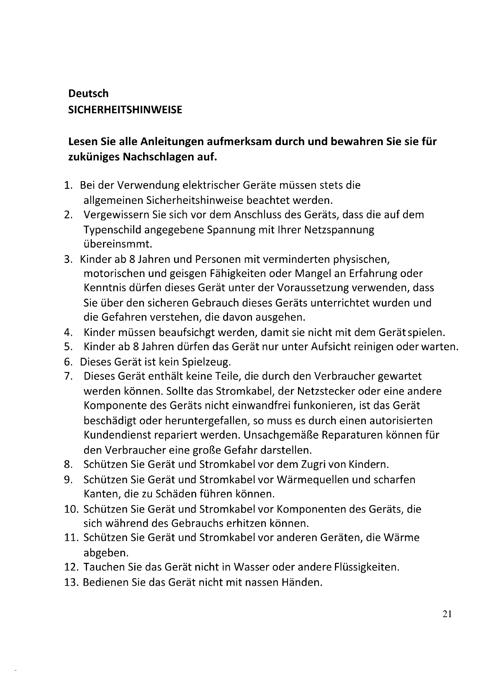 Deutsch SICHERHEITSHINWEISE Lesen Sie alle Anleitungen aufmerksam durch und bewahren Sie sie für zukünftiges Nachschlagen auf.
