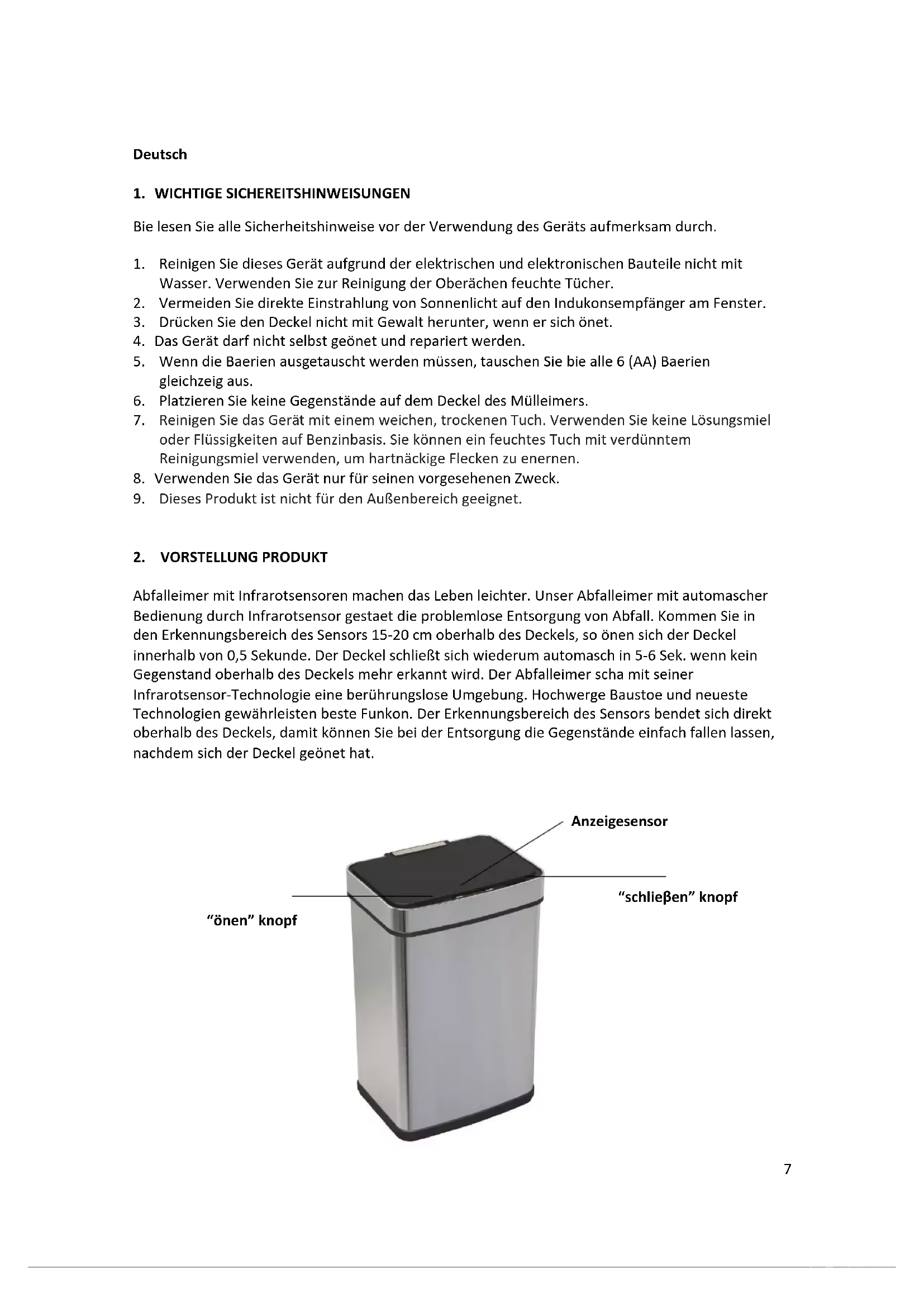 Schritt 1 Abfalleimer auspacken WARNUNG: Packen Sie alle Teile aus und entfernen Sie danach die Schutzmaterialien. Ermöglichen Sie Kindern nicht den Zugriff auf Plastiktüten. Die automatische Öffnungs- und Schließsteuerung besteht aus Computer-Chips, Infrarotsensor, mechanischer Übertragung und dem elektrischem Antrieb. Dieses Gerät ist ein Hochtechnologieprodukt mit Maschinen-, Licht- und Elektrotechnologie. Es besteht aus dem Deckel (mit allen mechanischen und elektronischen Bauteilen) und dem Behälter. Das Gerät hat eine lange Lebensdauer und geringen Energieverbrauch. Schritt 2 Batterien einsetzen Nehmen Sie die obere Abdeckung innen im Behälter ab. Öffnen Sie das Batteriefach und setzen Sie 6 A-Batterien. Achten Sie hierbei auf die Polarität. Und stellen Sie sicher, dass beim Einsetzen neuer Batterien alle 6 Batterien gleichzeitig ausgetauscht werden. Schritt 3 Abfalltüte einsetzen Setzen Sie die Mülltüte durch den Ringhalter ein. Setzen Sie die Mülltüte nun in den Behälter ein und drücken Sie sie vorsichtig an. Schritt 4 Abfalleimer montieren Setzen Sie die Vorderseite des Deckels an und drücken Sie ihn nach unten auf den Behälter. Dann setzen Sie die Rückseite an. Hinterseite erst andrücken und schalten Sie den Abfalleimer mit dem innen montierten Schalter ein auf der Unterseite der Deckel von hinten. Schritt 5 Infrarot-Bewegungssensor Beim Entsorgen halten Sie den Gegenstand oder die Hand RUHIG etwa 15-20 cm über dem Sensor. Der Deckel öffnet sich innerhalb von 0,5 Sek. und schließt sich nach 5-6 Sekunden wieder. Der Deckel bleibt solange geöffnet, wie ein Gegenstand oberhalb des Deckels erkannt wird. Mit der Öffnungstaste öffnen Sie den Deckel für einen längeren Zeitraum, bis er mit der Schließtaste wieder geschlossen wird. Die Schließtaste schließt den Deckel und stellt den Bewegungssensor für automatisches Öffnen und Schließen zurück. **Ein langes Öffnen des Deckels verbraucht Energie.9