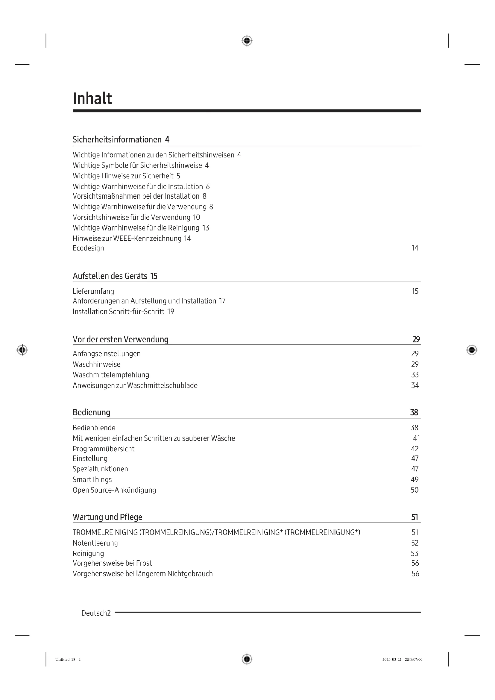 Untitled-19 1Untitled-19 1 2025-03-21 5:07:002025-03-21 5:07:00Deutsch2 Inhalt Sicherheitsinformationen 4 Wichtige Informationen zu den Sicherheitshinweisen 4 Wichtige Symbole für Sicherheitshinweise 4 Wichtige Hinweise zur Sicherheit 5 Wichtige Warnhinweise für die Installation 6 Vorsichtsmaßnahmen bei der Installation 8 Wichtige Warnhinweise für die Verwendung 8 Vorsichtshinweise für die Verwendung 10 Wichtige Warnhinweise für die Reinigung 13 Hinweise zur WEEE-Kennzeichnung 14 Ecodesign 14 Aufstellen des Geräts 15 Lieferumfang 15 Anforderungen an Aufstellung und Installation 17 Installation Schritt-für-Schritt 19 Vor der ersten Verwendung 29 Anfangseinstellungen 29 Waschhinweise 29 Waschmittelempfehlung 33 Anweisungen zur Waschmittelschublade 34 Bedienung 38 Bedienblende 38 Mit wenigen einfachen Schritten zu sauberer Wäsche 41 Programmübersicht 42 Einstellung 47 Spezialfunktionen 47 SmartThings 49 Open Source-Ankündigung 50 Wartung und Pege 51