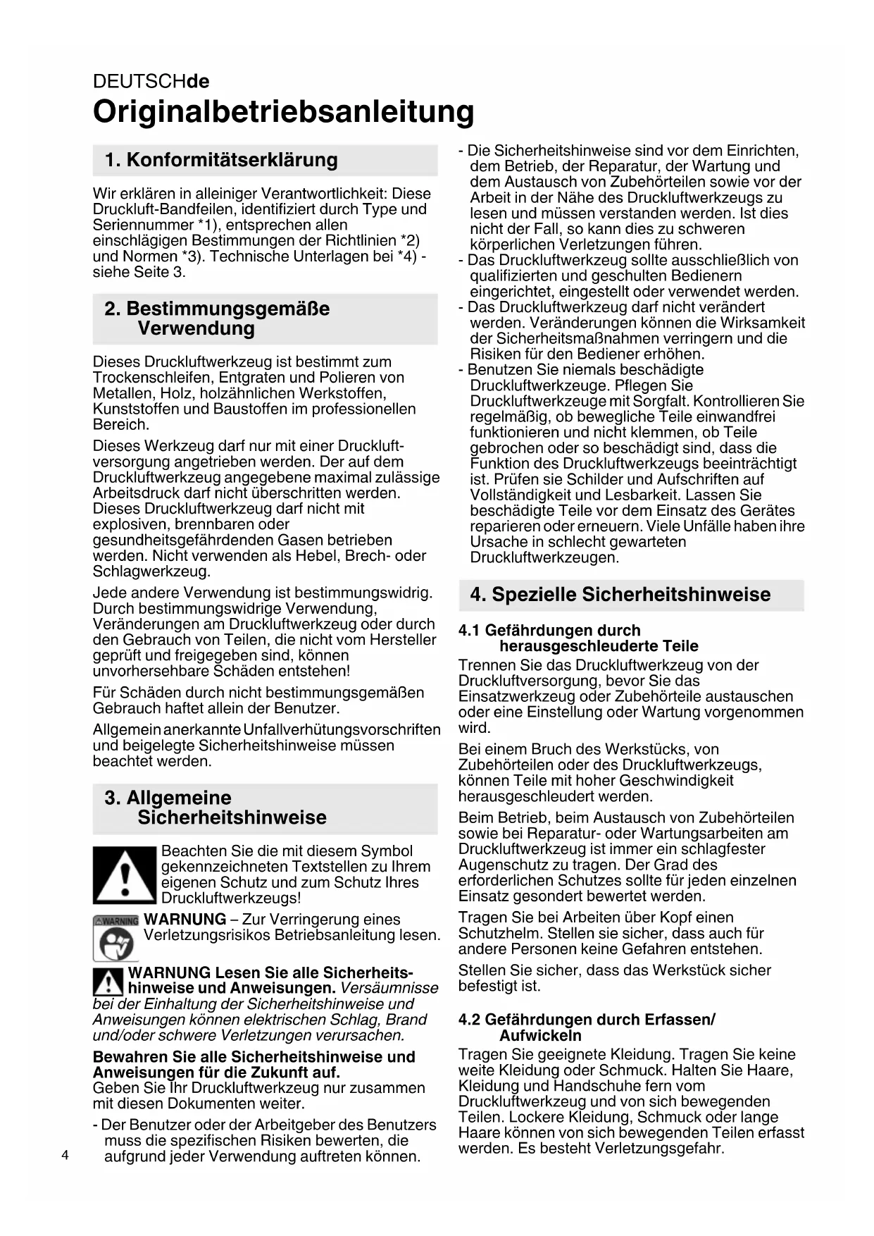 Originalbetriebsanleitung Wir erklären in alleiniger Verantwortlichkeit: Diese Druckluft-Bandfeilen, identifiziert durch Type und Seriennummer *1), entsprechen allen einschlägigen Bestimmungen der Richtlinien *2) und Normen *3). Technische Unterlagen bei *4) - siehe Seite 3. Dieses Druckluftwerkzeug ist bestimmt zum Trockenschleifen, Entgraten und Polieren von Metallen, Holz, holzähnlichen Werkstoffen, Kunststoffen und Baustoffen im professionellen Bereich. Dieses Werkzeug darf nur mit einer Druckluft- versorgung angetrieben werden. Der auf dem Druckluftwerkzeug angegebene maximal zulässige Arbeitsdruck darf nicht überschritten werden. Dieses Druckluftwerkzeug darf nicht mit explosiven, brennbaren oder gesundheitsgefährdenden Gasen betrieben werden. Nicht verwenden als Hebel, Brech- oder Schlagwerkzeug. Jede andere Verwendung ist bestimmungswidrig. Durch bestimmungswidrige Verwendung, Veränderungen am Druckluftwerkzeug oder durch den Gebrauch von Teilen, die nicht vom Hersteller geprüft und freigegeben sind, können unvorhersehbare Schäden entstehen! Für Schäden durch nicht bestimmungsgemäßen Gebrauch haftet allein der Benutzer. Allgemein anerkannte Unfallverhütungsvorschriften und beigelegte Sicherheitshinweise müssen beachtet werden. Beachten Sie die mit diesem Symbol gekennzeichneten Textstellen zu Ihrem eigenen Schutz und zum Schutz Ihres Druckluftwerkzeugs! WARNUNG – Zur Verringerung eines Verletzungsrisikos Betriebsanleitung lesen. WARNUNG Lesen Sie alle Sicherheits- hinweise und Anweisungen. Versäumnisse bei der Einhaltung der Sicherheitshinweise und Anweisungen können elektrischen Schlag, Brand und/oder schwere Verletzungen verursachen. Bewahren Sie alle Sicherheitshinweise und Anweisungen für die Zukunft auf. Geben Sie Ihr Druckluftwerkzeug nur zusammen mit diesen Dokumenten weiter. - Der Benutzer oder der Arbeitgeber des Benutzers muss die spezifischen Risiken bewerten, die aufgrund jeder Verwendung auftreten können. - Die Sicherheitshinweise sind vor dem Einrichten, dem Betrieb, der Reparatur, der Wartung und dem Austausch von Zubehörteilen sowie vor der Arbeit in der Nähe des Druckluftwerkzeugs zu lesen und müssen verstanden werden. Ist dies nicht der Fall, so kann dies zu schweren körperlichen Verletzungen führen. - Das Druckluftwerkzeug sollte ausschließlich von qualifizierten und geschulten Bedienern eingerichtet, eingestellt oder verwendet werden. - Das Druckluftwerkzeug darf nicht verändert werden. Veränderungen können die Wirksamkeit der Sicherheitsmaßnahmen verringern und die Risiken für den Bediener erhöhen. - Benutzen Sie niemals beschädigte Druckluftwerkzeuge. Pflegen Sie Druckluftwerkzeuge mit Sorgfalt. Kontrollieren Sie regelmäßig, ob bewegliche Teile einwandfrei funktionieren und nicht klemmen, ob Teile gebrochen oder so beschädigt sind, dass die Funktion des Druckluftwerkzeugs beeinträchtigt ist. Prüfen sie Schilder und Aufschriften auf Vollständigkeit und Lesbarkeit. Lassen Sie beschädigte Teile vor dem Einsatz des Gerätes reparieren oder erneuern. Viele Unfälle haben ihre Ursache in schlecht gewarteten Druckluftwerkzeugen.