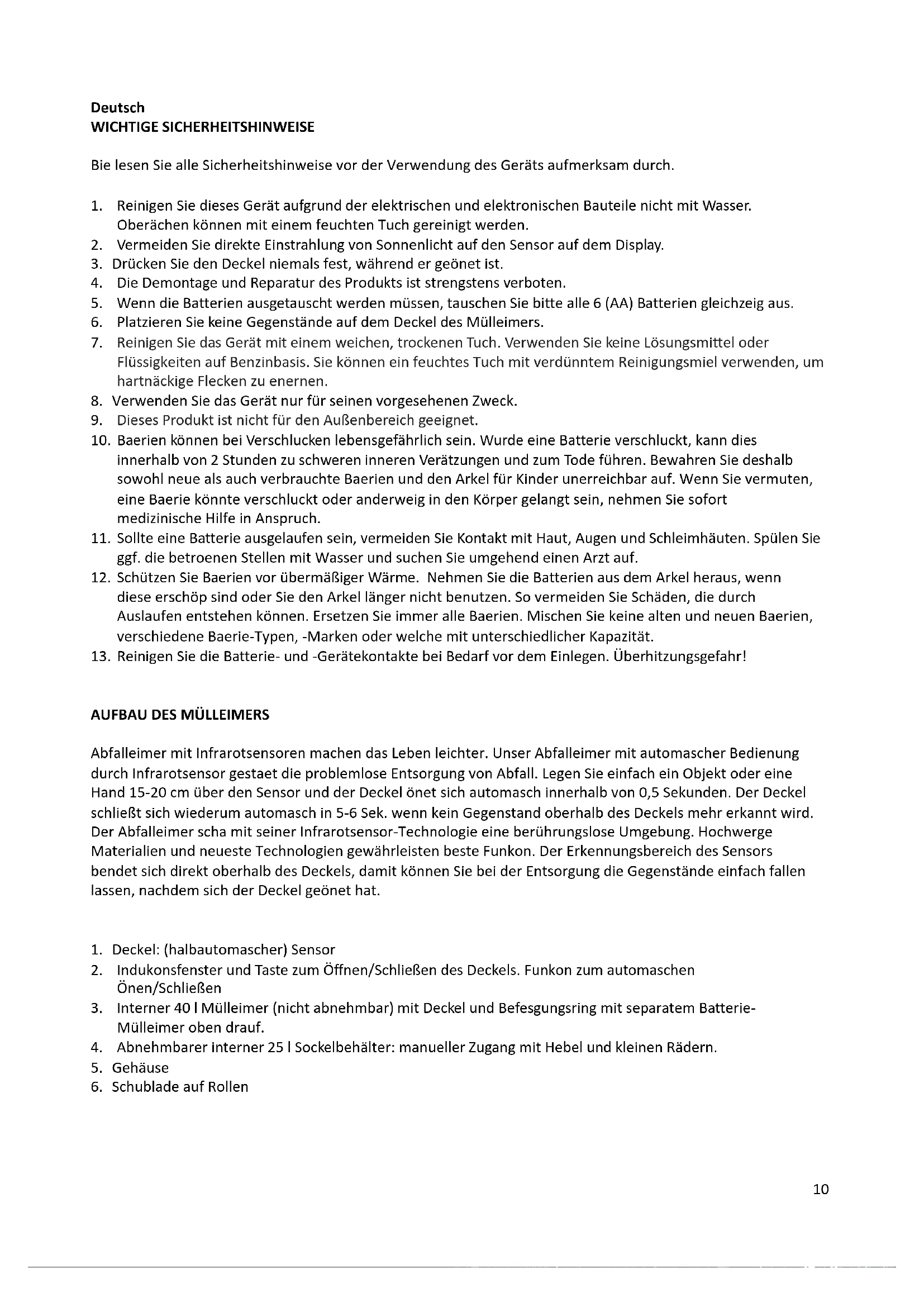 BEDIENUNGSANLEITUNG Schritt 1 Abfalleimer auspacken WARNUNG: Packen Sie alle Teile aus und entfernen Sie danach die Schutzmaterialien. Ermöglichen Sie Kindern nicht den Zugriff auf Plastiktüten. Die automatische Öffnungs- und Schließsteuerung besteht aus Computer-Chips, Infrarotsensor, mechanischer Übertragung und dem elektrischem Antrieb. Dieses Gerät ist ein Hochtechnologieprodukt mit Maschinen-, Licht- und Elektrotechnologie. Es besteht aus dem Deckel (mit allen mechanischen und elektronischen Bauteilen) und dem Behälter. Das Gerät hat eine lange Lebensdauer und geringen Energieverbrauch. Schritt 2 Batterien einsetzen Nehmen Sie die obere Abdeckung innen im Behälter ab. Öffnen Sie das Batteriefach und setzen Sie 6 A-Batterien ein. Achten Sie hierbei auf die Polarität. Stellen Sie sicher, dass beim Einsetzen neuer Batterien alle 6 Batterien gleichzeitig ausgetauscht werden. Schritt 3 Abfalltüte einsetzen Setzen Sie die Mülltüte durch den Ringhalter ein. Setzen Sie die Mülltüte nun in den Behälter ein und drücken Sie sie vorsichtig an. Schritt 4 Abfalleimer montieren Halten Sie die Vorderseite der oberen Abdeckung fest und drücken Sie die Oberseite der Schaufel nach unten. Legen Sie zuerst die Rückseite der oberen Abdeckung auf den Eimer und drücken Sie dann die vordere Abdeckung nach unten. Schalten Sie die Maschine ein, indem Sie den Ein-/Ausschalter am Deckel am Boden des Eimers einschalten. Schritt 5 Infrarot-Bewegungssensor Beim Entsorgen halten Sie den Gegenstand oder die Hand RUHIG etwa 15-20 cm über dem Sensor. Der Deckel öffnet sich innerhalb von 0,5 Sek. und schließt sich nach 5-6 Sekunden wieder. Der Deckel bleibt solange geöffnet, wie ein Gegenstand oberhalb des Deckels erkannt wird. Mit der Öffnungstaste öffnen Sie den Deckel für einen längeren Zeitraum, bis er mit der Schließtaste wieder geschlossen wird. Die Schließtaste schließt den Deckel und stellt den Bewegungssensor für automatisches Öffnen und Schließen zurück. **Ein langes Öffnen des Deckels verbraucht Energie. ***Ziehen Sie am inneren unteren Eimer, um dort Recyclingmüll zu entsorgen. Der innere obere Eimer wird für nicht recycelbare Haushaltsabfälle verwendet.12 ****Wir empfehlen, Müllbeutel mit einer Kapazität von 40 Litern zu verwenden, um Gesundheitsprobleme und Geruchsbelästigung zu vermeiden.