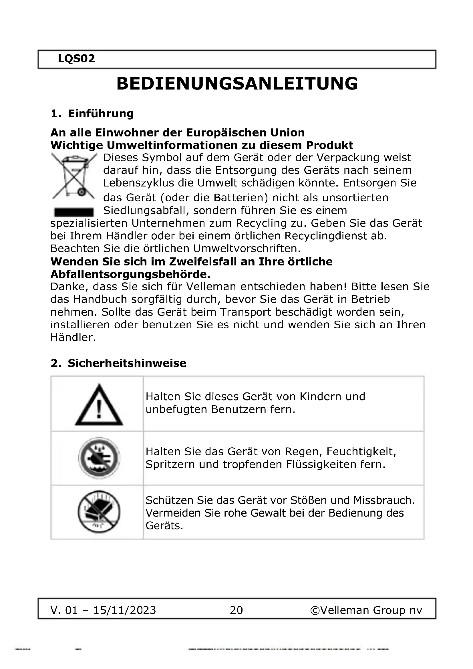 Verwenden Sie dieses Gerät nur mit Originalzubehör. Die Velleman Group nv kann nicht für Schäden oder Verletzungen verantwortlich gemacht werden, die durch den (falschen) Gebrauch dieses Geräts entstehen. Weitere Informationen zu diesem Produkt und die neueste Version dieses Handbuchs finden Sie auf unserer Website www.velleman.eu. Die Informationen in diesem Handbuch können ohne vorherige Ankündigung geändert werden. © COPYRIGHT-VERMERK Das Urheberrecht an diesem Handbuch liegt bei der Velleman Group nv. Alle weltweiten Rechte vorbehalten. Kein Teil dieses Handbuchs darf ohne die vorherige schriftliche Zustimmung des Urheberrechtsinhabers kopiert, reproduziert, übersetzt oder auf ein elektronisches Medium oder anderweitig reduziert werden.LQS02