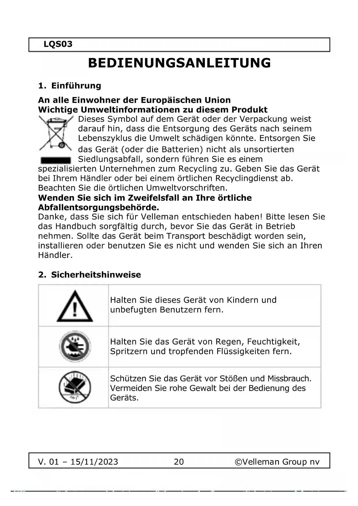 Verwenden Sie dieses Gerät nur mit Originalzubehör. Die Velleman Group nv kann nicht für Schäden oder Verletzungen verantwortlich gemacht werden, die durch den (falschen) Gebrauch dieses Geräts entstehen. Weitere Informationen zu diesem Produkt und die neueste Version dieses Handbuchs finden Sie auf unserer Website www.velleman.eu. Die Informationen in diesem Handbuch können ohne vorherige Ankündigung geändert werden. © COPYRIGHT-VERMERK Das Urheberrecht an diesem Handbuch liegt bei der Velleman Group nv. Alle weltweiten Rechte vorbehalten. Kein Teil dieses Handbuchs darf ohne die vorherige schriftliche Zustimmung des Urheberrechtsinhabers kopiert, reproduziert, übersetzt oder auf ein elektronisches Medium oder anderweitig reduziert werden.LQS03