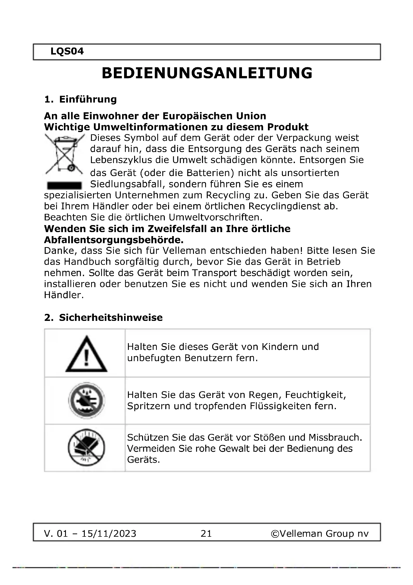 Verwenden Sie dieses Gerät nur mit Originalzubehör. Die Velleman Group nv kann nicht für Schäden oder Verletzungen verantwortlich gemacht werden, die durch den (falschen) Gebrauch dieses Geräts entstehen. Weitere Informationen zu diesem Produkt und die neueste Version dieses Handbuchs finden Sie auf unserer Website www.velleman.eu. Die Informationen in diesem Handbuch können ohne vorherige Ankündigung geändert werden. © COPYRIGHT-VERMERK Das Urheberrecht an diesem Handbuch liegt bei der Velleman Group nv. Alle weltweiten Rechte vorbehalten. Kein Teil dieses Handbuchs darf ohne die vorherige schriftliche Zustimmung des Urheberrechtsinhabers kopiert, reproduziert, übersetzt oder auf ein elektronisches Medium oder anderweitig reduziert werden.LQS04