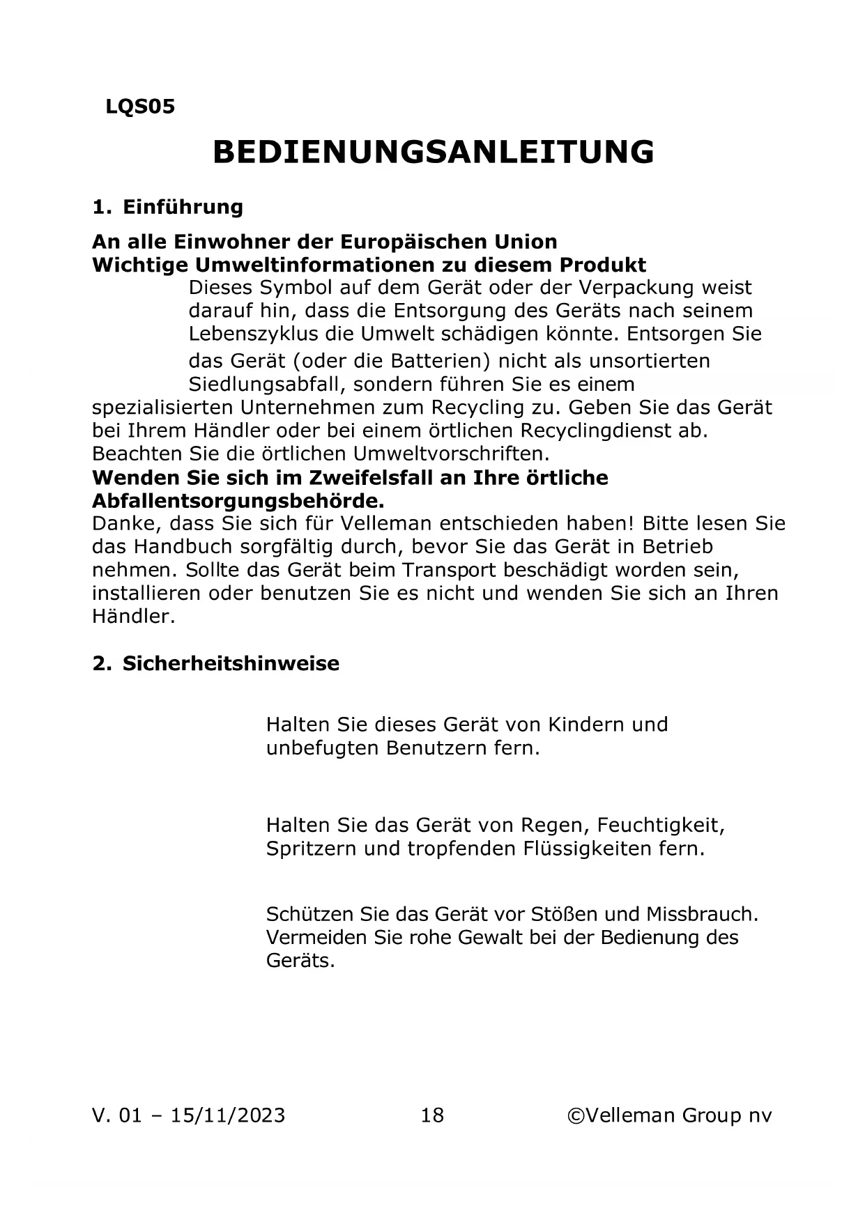 Verwenden Sie dieses Gerät nur mit Originalzubehör. Die Velleman Group nv kann nicht für Schäden oder Verletzungen verantwortlich gemacht werden, die durch den (falschen) Gebrauch dieses Geräts entstehen. Weitere Informationen zu diesem Produkt und die neueste Version dieses Handbuchs finden Sie auf unserer Website www.velleman.eu. Die Informationen in diesem Handbuch können ohne vorherige Ankündigung geändert werden.LQS05