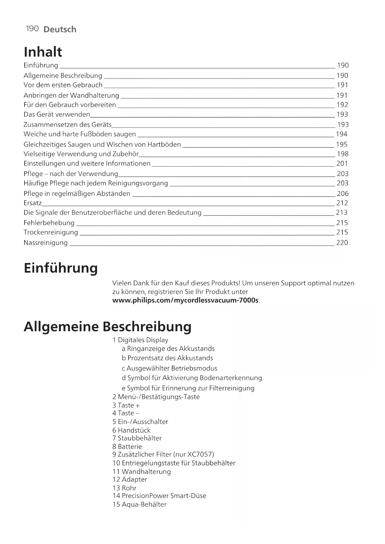 Deutsch Inhalt Einführung ________________________________________________________________________________ 190 Allgemeine Beschreibung ___________________________________________________________________ 190 Vor dem ersten Gebrauch ___________________________________________________________________ 191 Anbringen der Wandhalterung ______________________________________________________________ 191 Für den Gebrauch vorbereiten _______________________________________________________________ 192 Das Gerät verwenden_______________________________________________________________________ 193 Zusammensetzen des Geräts_________________________________________________________________ 193 Weiche und harte Fußböden saugen _________________________________________________________ 194 Gleichzeitiges Saugen und Wischen von Hartböden ____________________________________________ 195 Vielseitige Verwendung und Zubehör_________________________________________________________ 198 Einstellungen und weitere Informationen _____________________________________________________ 201 Pflege – nach der Verwendung_______________________________________________________________ 203 Häufige Pflege nach jedem Reinigungsvorgang ________________________________________________ 203 Pflege in regelmäßigen Abständen ___________________________________________________________ 206 Ersatz_____________________________________________________________________________________ 212 Die Signale der Benutzeroberfläche und deren Bedeutung ______________________________________ 213 Fehlerbehebung ___________________________________________________________________________ 215 Trockenreinigung __________________________________________________________________________ 215 Nassreinigung _____________________________________________________________________________ 220 Einführung Vielen Dank für den Kauf dieses Produkts! Um unseren Support optimal nutzen zu können, registrieren Sie Ihr Produkt unter www.philips.com/mycordlessvacuum-7000s. Allgemeine Beschreibung 1 Digitales Display a Ringanzeige des Akkustands b Prozentsatz des Akkustands c Ausgewählter Betriebsmodus d Symbol für Aktivierung Bodenarterkennung e Symbol für Erinnerung zur Filterreinigung 2 Menü-/Bestätigungs-Taste 3 Taste + 4 Taste – 5 Ein-/Ausschalter 6 Handstück 7 Staubbehälter 8 Batterie 9 Zusätzlicher Filter (nur XC7057) 10 Entriegelungstaste für Staubbehälter 11 Wandhalterung 12 Adapter 13 Rohr 14 PrecisionPower Smart-Düse 15 Aqua-Behälter191 Deutsch 16 Mikrofaserwischtuch 17 Mini-Turbobürste (nur XC7055, XC7057) 18 Kombinationsdüse 19 Weiche Bürste (nur XC7057) 20 Polsterdüse (nur XC7055, XC7057) 21 Fugendüse Vor dem ersten Gebrauch Anbringen der Wandhalterung 1 Drehen Sie die Wandhalterung zur Seite und entriegeln Sie den grauen Hebel. Setzen Sie den Ladeanschluss so ein, dass das Metallteil sichtbar ist und aufrecht zur Vorderseite der Wandhalterung weist. 2 Legen Sie das Kabel ordentlich ein, indem Sie es in die dafür vorgesehene Rille stecken. 3 Schließen Sie den grauen Hebel. Stellen Sie sicher, dass der graue Hebel hörbar einrastet. 110 ± 2 cm 4 Befestigen Sie die Wandhalterung sicher an der gewünschten Stelle an der Wand und achten Sie darauf, dass die Schraubenlöcher etwa 110cm vom Boden entfernt sind. Achtung: Seien Sie vorsichtig, wenn Sie Löcher in die Wand bohren, um die Wandhalterung anzubringen. Es besteht das Risiko eines Stromschlags.192 Deutsch Hinweis: Vergewissern Sie sich, dass die Wandhalterung so angebracht ist, dass das gesamte Gerät an der Wand hängen kann, ohne dass die Düse mit dem Boden in Berührung kommt. 5 Sobald Sie die optimale Position und Höhe für die Aufbewahrung und das Aufladen Ihres Geräts ermittelt haben, ziehen Sie die Schrauben fest an, um die Wandhalterung zu befestigen. Für den Gebrauch vorbereiten Das Gerät ist mit einem Lithium-Ionen-Akku ausgestattet. Das vollständige Aufladen des leeren Akkus dauert ca. 6Stunden. 1 Bringen Sie den Akku am Hauptteil des Geräts an. Achten Sie auf eine sichere Verbindung, die durch hörbares Einrasten bestätigt wird. MAX 40⁰C MIN 5⁰C 2 Laden Sie Ihr Gerät auf, indem Sie es in die montierte Wandhalterung schieben. Warnhinweis: Laden Sie das Gerät bei Temperaturen über 5°C und unter 40°C auf. Bewahren Sie es auch in diesem Temperaturbereich auf.193 Deutsch Hinweis: Sie können das Handstück auch auf einer ebenen und stabilen Fläche ablegen und das Ladekabel direkt an das Gerät anschließen.