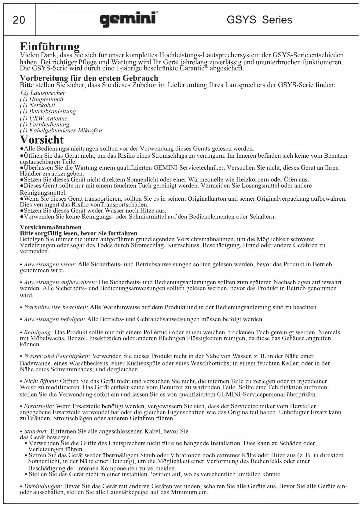 optimale.2. Appuyez sur [SOURCE] pour sélectionner le mode FM.3. Appuyez sur la touche CH+/CH- de la télécommande ou maintenez la touche [ / ] sur le panneau supérieur pour passer àla station préréglée.4. Appuyez sur la touche TU+/TU- de la télécommande ou appuyez sur la touche [ / ] du panneau supérieur pour réglerla fréquence radio manuellement.(La touche numérique de la télécommande peut sélectionner directement la fréquence. Par exemple, entrez les touches ¡° 8, 8, 1".pour 88,1 MHz, touches ¡±1,0,4,0" pour 104,0 MHz.)Appuyez sur la touche PLAY de la télécommande ou appuyez sur la touche [ ] du panneau supérieur, la machinebalayer les canaux radio de basse fréquence à haute fréquence par lui-même et mémoriser les canaux unpar un. Caractéristiques DIAGRAMME DE CONNEXION: Noter: - Débranchez toujours l'appareil de l'alimentation lors des connexions. - Vérifiez que toutes les connexions sont solidement fixées. - Vérifiez que les deux haut-parleurs sont connectés à leur position désignée correcte.Ant ena FMGSYS-2400 2 x 8” 6.5” 1"+3" 120W 30Hz-20KHz100-240V~,50/60HzLF Driver Size (Subwoofer)MF Driver Size(main speaker)HF Driver Size(main speaker) Total Power Frequency ResponsePower Source Type mural Support microphone à l'arrière du Haut - parleur size:105x148mm20 GSYS Series Einführung Vielen Dank, dass Sie sich für unser komplettes Hochleistungs-Lautsprechersystem der GSYS-Serie entschieden haben. Bei richtiger Pflege und Wartung wird Ihr Gerät jahrelang zuverlässig und ununterbrochen funktionieren. Die GSYS-Serie wird durch eine 1-jährige beschränkte Garantie* abgesichert. Vorbereitung für den ersten Gebrauch Bitte stellen Sie sicher, dass Sie dieses Zubehör im Lieferumfang Ihres Lautsprechers der GSYS-Serie finden: (2) Lautsprecher(1) Haupteinheit(1) Netzkabel(1) Betriebsanleitung(1) UKW-Antenne(1) Fernbedienung(1) Kabelgebundenes Mikrofon Vorsicht ●Alle Bedienungsanleitungen sollten vor der Verwendung dieses Geräts gelesen werden. ●Öffnen Sie das Gerät nicht, um das Risiko eines Stromschlags zu verringern. Im Inneren befinden sich keine vom Benutzer austauschbaren Teile.●Überlassen Sie die Wartung einem qualifizierten GEMINI-Servicetechniker. Versuchen Sie nicht, dieses Gerät an Ihren Händler zurückzugeben.●Setzen Sie dieses Gerät nicht direktem Sonnenlicht oder einer Wärmequelle wie Heizkörpern oder Öfen aus.●Dieses Gerät sollte nur mit einem feuchten Tuch gereinigt werden. Vermeiden Sie Lösungsmittel oder andere Reinigungsmittel. ●Wenn Sie dieses Gerät transportieren, sollten Sie es in seinem Originalkarton und seiner Originalverpackung aufbewahren. Dies verringert das Risiko vonTransportschäden.●Setzen Sie dieses Gerät weder Wasser noch Hitze aus.●Verwenden Sie keine Reinigungs- oder Schmiermittel auf den Bedienelementen oder Schaltern.VorsichtsmaßnahmenBitte sorgfältig lesen, bevor Sie fortfahrenBefolgen Sie immer die unten aufgeführten grundlegenden Vorsichtsmaßnahmen, um die Möglichkeit schwerer Verletzungen oder sogar des Todes durch Stromschlag, Kurzschluss, Beschädigung, Brand oder andere Gefahren zu vermeiden.