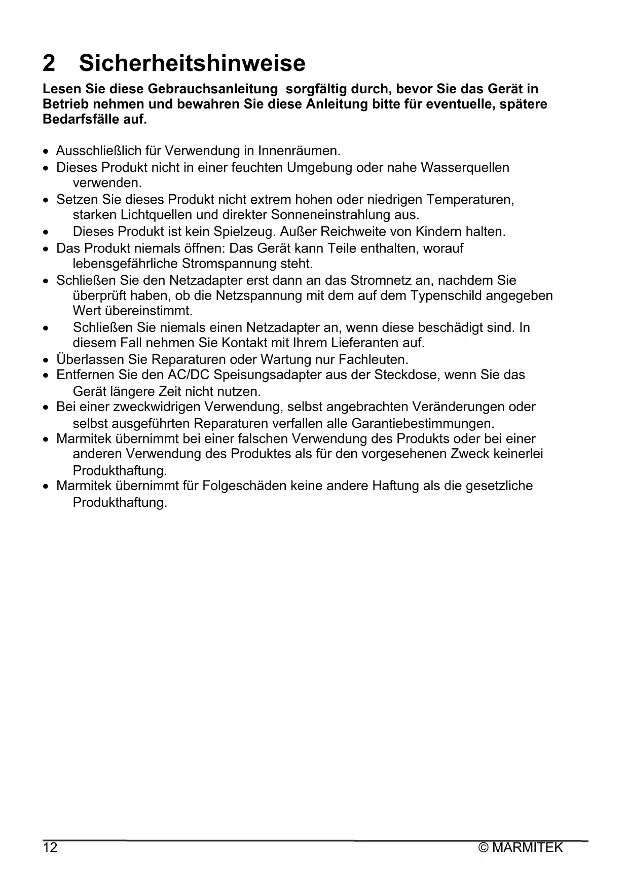 2 Sicherheitshinweise Lesen Sie diese Gebrauchsanleitung sorgfältig durch, bevor Sie das Gerät in Betrieb nehmen und bewahren Sie diese Anleitung bitte für eventuelle, spätere Bedarfsfälle auf. x Ausschließlich für Verwendung in Innenräumen. x Dieses Produkt nicht in einer feuchten Umgebung oder nahe Wasserquellen verwenden. x Setzen Sie dieses Produkt nicht extrem hohen oder niedrigen Temperaturen, starken Lichtquellen und direkter Sonneneinstrahlung aus. x Dieses Produkt ist kein Spielzeug. Außer Reichweite von Kindern halten. x Das Produkt niemals öffnen: Das Gerät kann Teile enthalten, worauf lebensgefährliche Stromspannung steht. x Schließen Sie den Netzadapter erst dann an das Stromnetz an, nachdem Sie überprüft haben, ob die Netzspannung mit dem auf dem Typenschild angegeben Wert übereinstimmt. x Schließen Sie niemals einen Netzadapter an, wenn diese beschädigt sind. In diesem Fall nehmen Sie Kontakt mit Ihrem Lieferanten auf. x Überlassen Sie Reparaturen oder Wartung nur Fachleuten. x Entfernen Sie den AC/DC Speisungsadapter aus der Steckdose, wenn Sie das Gerät längere Zeit nicht nutzen. x Bei einer zweckwidrigen Verwendung, selbst angebrachten Veränderungen oder selbst ausgeführten Reparaturen verfallen alle Garantiebestimmungen. x Marmitek übernimmt bei einer falschen Verwendung des Produkts oder bei einer anderen Verwendung des Produktes als für den vorgesehenen Zweck keinerlei Produkthaftung. x Marmitek übernimmt für Folgeschäden keine andere Haftung als die gesetzliche Produkthaftung.SPLIT 614 UHD 2.0™
