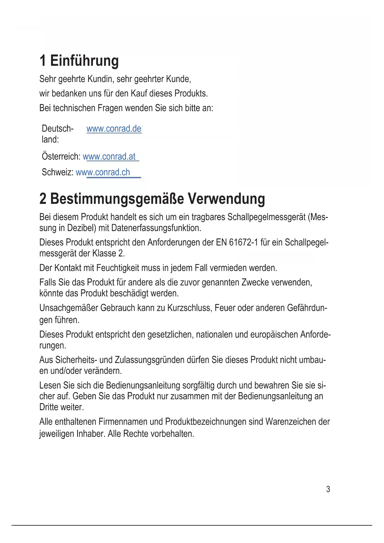 1 Einführung Sehr geehrte Kundin, sehr geehrter Kunde, wir bedanken uns für den Kauf dieses Produkts. Bei technischen Fragen wenden Sie sich bitte an: Deutsch- land: www.conrad.de Österreich: www.conrad.at Schweiz: www.conrad.ch 2 Bestimmungsgemäße Verwendung Bei diesem Produkt handelt es sich um ein tragbares Schallpegelmessgerät (Mes- sung in Dezibel) mit Datenerfassungsfunktion. Dieses Produkt entspricht den Anforderungen der EN 61672-1 für ein Schallpegel- messgerät der Klasse 2. Der Kontakt mit Feuchtigkeit muss in jedem Fall vermieden werden. Falls Sie das Produkt für andere als die zuvor genannten Zwecke verwenden, könnte das Produkt beschädigt werden. Unsachgemäßer Gebrauch kann zu Kurzschluss, Feuer oder anderen Gefährdun- gen führen. Dieses Produkt entspricht den gesetzlichen, nationalen und europäischen Anforde- rungen. Aus Sicherheits- und Zulassungsgründen dürfen Sie dieses Produkt nicht umbau- en und/oder verändern. Lesen Sie sich die Bedienungsanleitung sorgfältig durch und bewahren Sie sie si- cher auf. Geben Sie das Produkt nur zusammen mit der Bedienungsanleitung an Dritte weiter. Alle enthaltenen Firmennamen und Produktbezeichnungen sind Warenzeichen der jeweiligen Inhaber. Alle Rechte vorbehalten.4 3 Lieferumfang