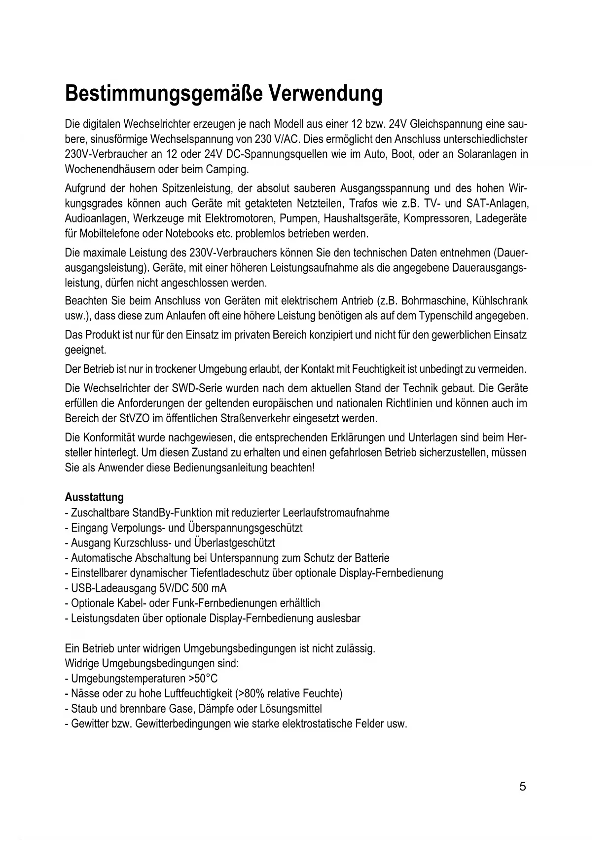 Bei unsachgemäßem Zusammenbau können selbst am geschlossenen Gerät gefährli- che Berührungsspannungen entstehen! Batteriehinweise Blei-Batterien stellen bei nicht sachgemäßem Gebrauch eine große Gefahr für Menschen, Tiere und Umwelt dar. Beachten Sie stets die Sicherheitshinweise des Batterieherstellers! Blei-Batterien enthalten aggressive ätzende Säuren. Vermeiden Sie Haut- und Augenkontakt mit Flüssig- keiten aus der Batterie! Zerlegen Sie Blei-Batterien niemals! Waschen Sie betroffene Hautpartien gründlich mit Wasser und Seife ab. Ist Säure ins Auge gelangt, waschen Sie dieses sofort unter fließendem, klarem und kaltem Wasser aus! Suchen Sie danach sofort einen Arzt auf! Ist Säure auf Ihre Kleidung gelangt, so waschen Sie diese sofort mit viel Wasser und Seife aus! Beachten Sie die Sicherheitshinweise des Akkuherstellers.10 Funktionsbeschreibung Die Wechselrichter der SWD-Serie sind moderne, mikroprozessorgesteuerte Geräte, die zur mobilen Stromversorgung entwickelt wurden. Die Wechselrichter setzen je nach Typ eine 12 bzw. 24 V/DC-Ein- gangsspannung in eine höhere AC-Ausgangsspannung um und ermöglichen somit den Betrieb von her- kömmlichen 230V/AC-Verbrauchern unterwegs. Diese Geräte bieten eine echte Sinus Wechselspannung, womit auch so genannte schwierige Verbraucher wie PCs, TV-Anlagen und Geräte mit Transformatoren oder Motoren problemlos betrieben werden können. Alle Geräte der SWD-Serie sind mit allen erforderlichen Sicherheitsmerkmalen, die einem zeitgemäßen Produkt entsprechen, ausgestattet. Ausstattungsmerkmale - Echte 230V/AC 50Hz Sinus Ausgangsspannung - Galvanisch getrennt - Hoher Wirkungsgrad - StandBy Funktion - Leistungs- und temperaturgesteuerter Lüfter - Softstartfunktion für Verbraucher mit hohem Einschaltstrom - Verschiedene Fernbedienungen als Zubehör erhältlich - Überspannungsabschaltung - Einstellbarer, dynamischer Tiefentladeschutz über optionale Display-Fernbedienungen - Überlastmanagement - Kurzschlussabschaltung - Verpolungsschutz - Temperaturschutzschaltung DC-Anschluss Verwenden Sie für den Anschluss der DC-Leitung nur möglichst kurze Kabel mit ausreichendem Quer- schnitt und achten Sie auf einen guten Kontakt, sowohl an der Batterie als auch am Wechselrichter. Zu dünne oder lose Verbindungen können aufgrund von Überhitzung zu einem Brand führen! Der Betriebsschalter (11) an der Frontseite des Gerätes muss auf „AUS“ (Position 0) stehen. Direkt an der Batterie muss eine Hochstromsicherung eingebaut werden. Fehlt diese Sicherung, kann es im Falle eines Kurzschlusses der beiden Anschlusskabel zu einem Brand führen.