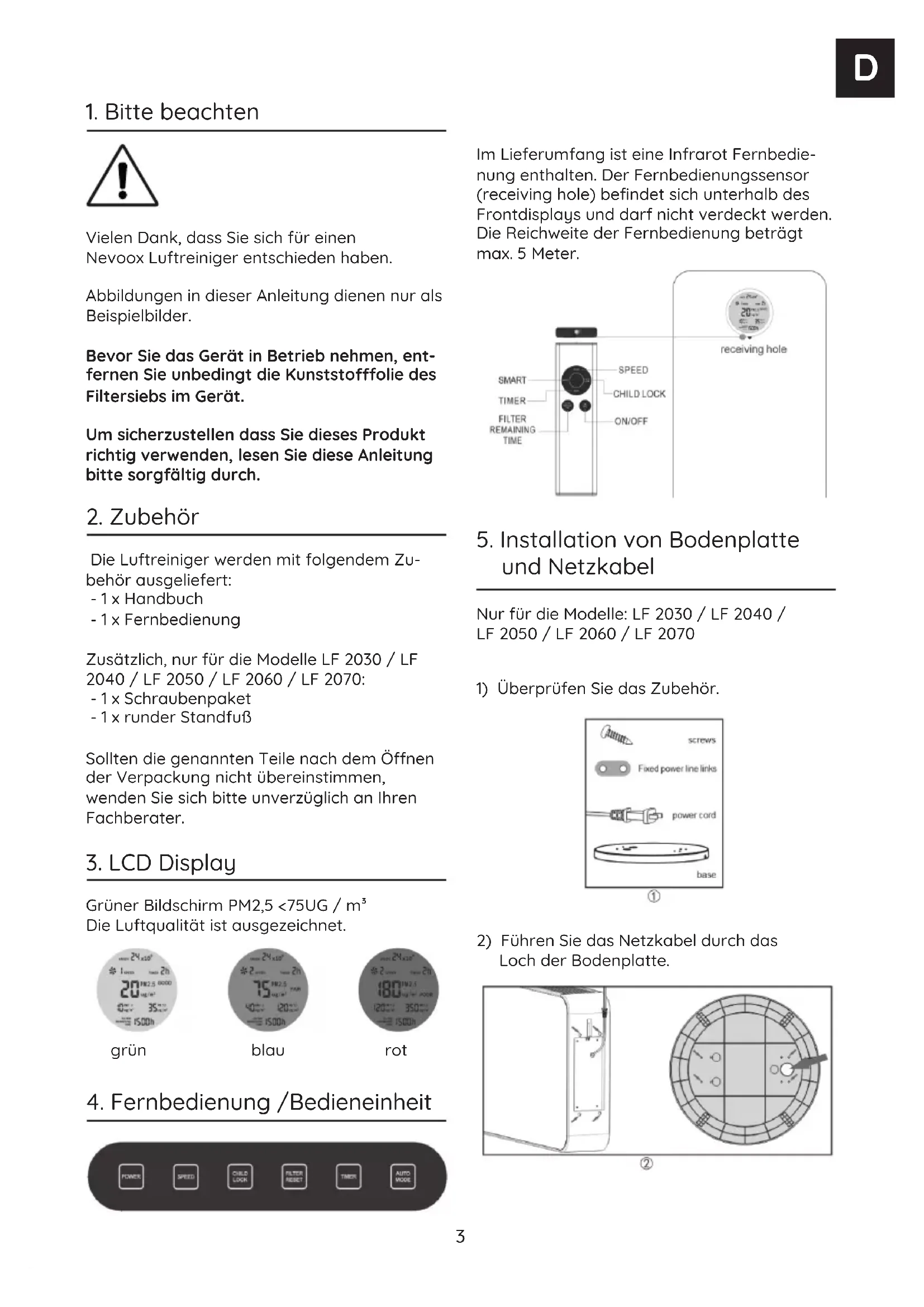 Die Luftreiniger werden mit folgendem Zu- behör ausgeliefert: - 1 x Handbuch - 1 x Fernbedienung Zusätzlich, nur für die Modelle LF 2030 / LF 2040 / LF 2050 / LF 2060 / LF 2070: - 1 x Schraubenpaket - 1 x runder Standfuß Sollten die genannten Teile nach dem Önen der Verpackung nicht übereinstimmen, wenden Sie sich bitte unverzüglich an Ihren Fachberater. Produkt Bestandteile / Product Components / Composantes du produit