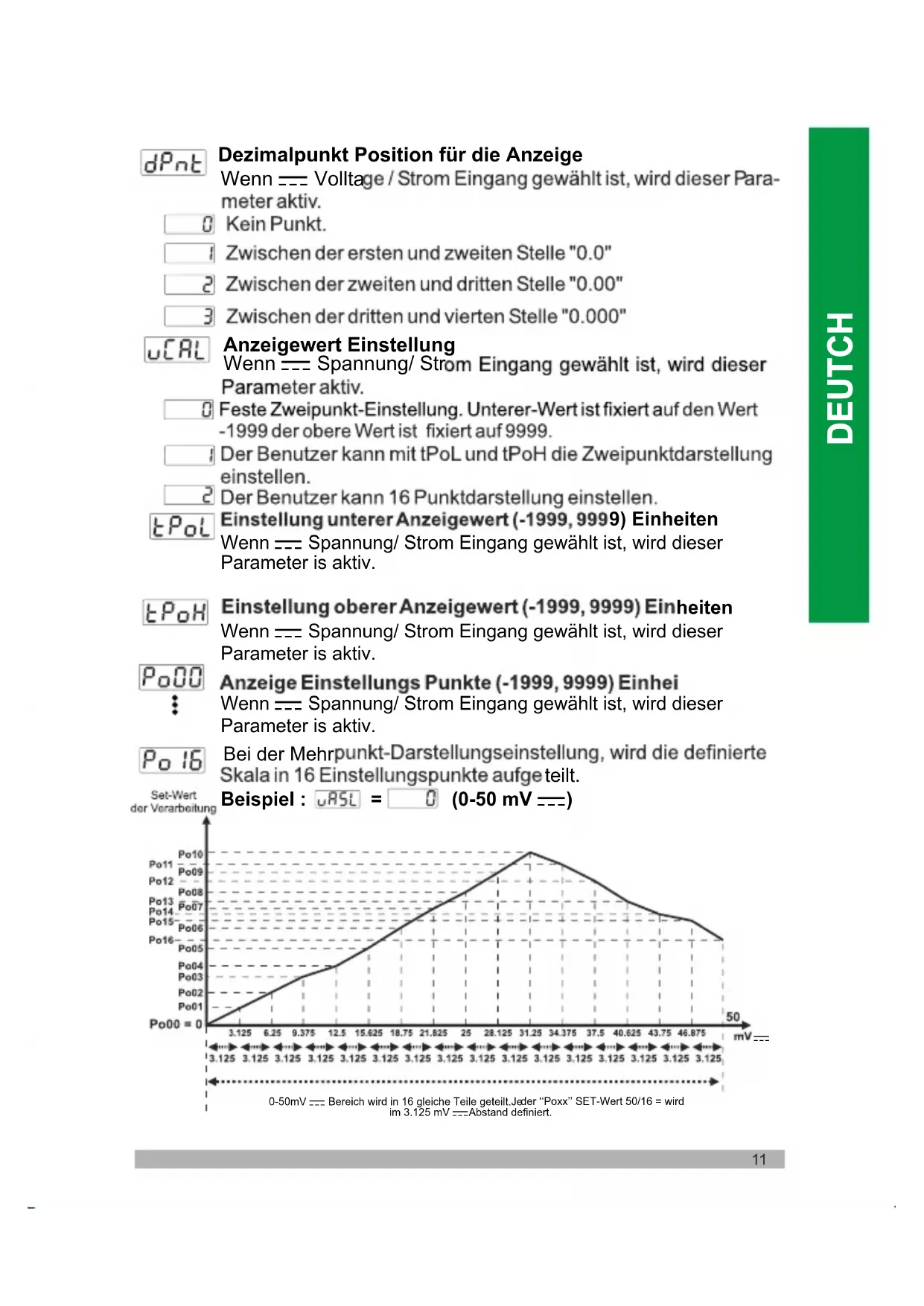 Wenn Z Spannung/ Strom Eingang gewählt ist, wird dieser Parameter is aktiv. Wenn Z Spannung/ Strom Eingang gewählt ist, wird dieser Parameter is aktiv. heiten Bei der Mehr Wenn Z Spannung/ Strom Eingang gewählt ist, wird dieser Parameter is aktiv. teilt. Beispiel : = (0-50 mV Z) der ‘‘Poxx’’ SET-Wert 50/16 = wirdim 3.125 mV Z Abstand definiert. 0-50mV Z Bereich wird in 16 gleiche Teile geteilt.JeDEUTCH