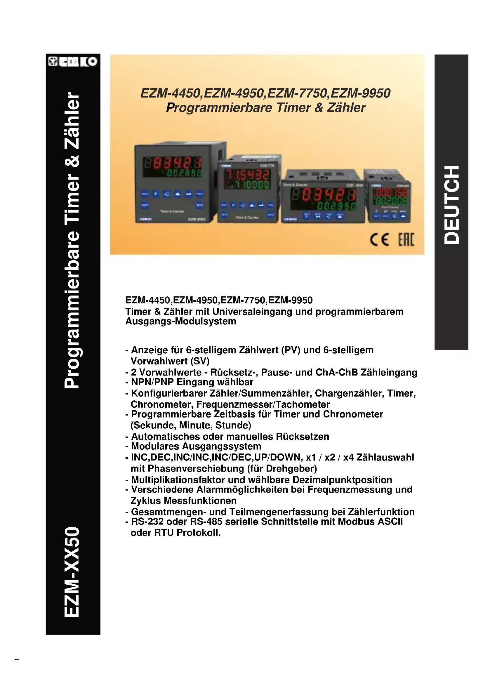 Timer & Zähler mit Universaleingang und programmierbarem Ausgangs-ModulsystemSPEZIFIKATION: EINGÄNGE: Zähleingänge (Ch-A,Ch-B): Schalter, Näherungsschalter,Kapazitivsensor oder Drehgeber Rücksetzeingang: Schalter, Näherungsschalter, Kapazitivsensor oder Drehgeber Pauseeingang: Schalter, Näherungsschalter, Kapazitivsensor oder Drehgeber Sensortyp: NPN oder PNP Rücksetzfunktion: automatisch oder manuell Zähleingänge und maximale Frequenzen: INC,DEC,INC/INC,INC/DEC,UP/DOWN x1 / x2 / x4: Phasen-verschiebung (Drehgeber) AUSGÄNGE Ausgabemodule: 2 Ausgänge wahlweise Relais, SSR oder Transistor - Relais 3 A @ 250 VV - SSR max. 20mA @ 18 VZ - Transistor max. 40mA @18 VZ ANZEIGE Anzeige für den aktuellen Wert: EZM-4450: 8 mm rote 6-stellige LED-Anzeige EZM-4950: 13.2 mm rote 6-stellige LED-Anzeige EZM-7750: 10.8 mm rote 6-stellige LED-Anzeige EZM-9950: 13.2 mm rote 6-stellige LED-Anzeige Anzeige für Set-Wert: EZM-4450: 8 mm grüne 6-stellige LED-Anzeige EZM-4950: 8 mm grüne 6-stellige LED-Anzeige EZM-7750: 8 mm grüne 6-stellige LED-Anzeige EZM-9950: 8 mm grüne 6-stellige LED-Anzeige LED-Anzeigen : Vorwahlwert 1/2; Ausgang 1/2 VERSORGUNG Versorgungsspannung : 100-240 V 50/60 Hz (-15%;+10%) 6VA 24 VV 50/60 Hz (-15% ; +10%) 6VA 24 VZ (-15% ; +10%) 6W (Bei Bestellung angeben)