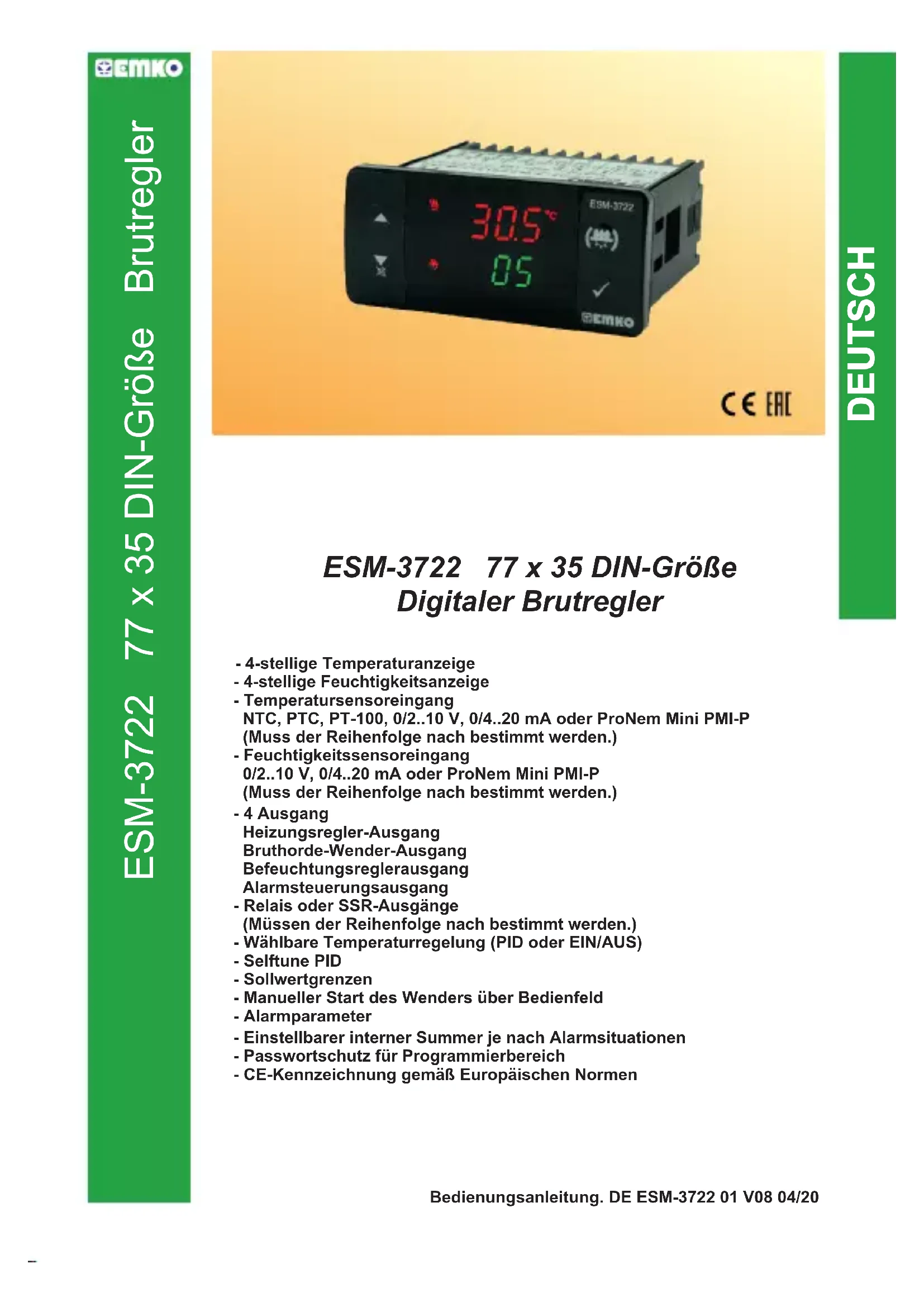 - User definedUser defined (Pt100 Temperature and Humidity Sensor with 2.5 mt cable)ESM-3722 77 x 35 DIN-Größe Brutregler Bedienungsanleitung. DE ESM-3722 01 V08 04/20 - 4-stellige Temperaturanzeige - 4-stellige Feuchtigkeitsanzeige - Temperatursensoreingang NTC, PTC, PT-100, 0/2 p. 10