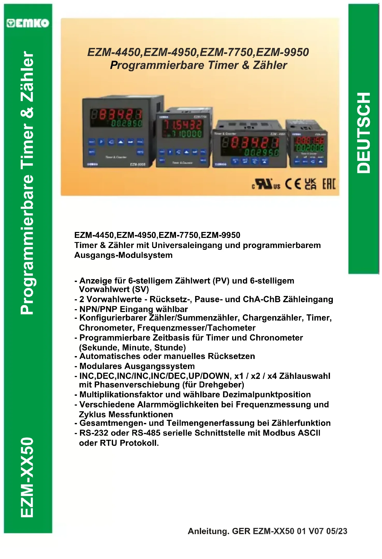 Timer & Zähler mit Universaleingang und programmierbarem Ausgangs-Modulsystem Anleitung. GER EZM-XX50 01 V07 05/23SPEZIFIKATION: EINGÄNGE: Zähleingänge (Ch-A,Ch-B): Schalter, Näherungsschalter,Kapazitivsensor oder Drehgeber Rücksetzeingang: Schalter, Näherungsschalter, Kapazitivsensor oder Drehgeber Pauseeingang: Schalter, Näherungsschalter, Kapazitivsensor oder Drehgeber Sensortyp: NPN oder PNP Rücksetzfunktion: automatisch oder manuell Zähleingänge und maximale Frequenzen: INC,DEC,INC/INC,INC/DEC,UP/DOWN x1 / x2 / x4: Phasen-verschiebung (Drehgeber) AUSGÄNGE Ausgabemodule: 2 Ausgänge wahlweise Relais, SSR oder Transistor - Relais 3 A @ 250 VV - SSR max. 20mA @ 18 VZ - Transistor max. 40mA @18 VZ ANZEIGE Anzeige für den aktuellen Wert: EZM-4450: 8 mm rote 6-stellige LED-Anzeige EZM-4950: 13.2 mm rote 6-stellige LED-Anzeige EZM-7750: 10.8 mm rote 6-stellige LED-Anzeige EZM-9950: 13.2 mm rote 6-stellige LED-Anzeige Anzeige für Set-Wert: EZM-4450: 8 mm grüne 6-stellige LED-Anzeige EZM-4950: 8 mm grüne 6-stellige LED-Anzeige EZM-7750: 8 mm grüne 6-stellige LED-Anzeige EZM-9950: 8 mm grüne 6-stellige LED-Anzeige LED-Anzeigen : Vorwahlwert 1/2; Ausgang 1/2 VERSORGUNG Versorgungsspannung : 100-240 V 50/60 Hz (-15%;+10%) 6VA 24 VV 50/60 Hz (-15% ; +10%) 6VA 24 VZ (-15% ; +10%) 6W (Bei Bestellung angeben)