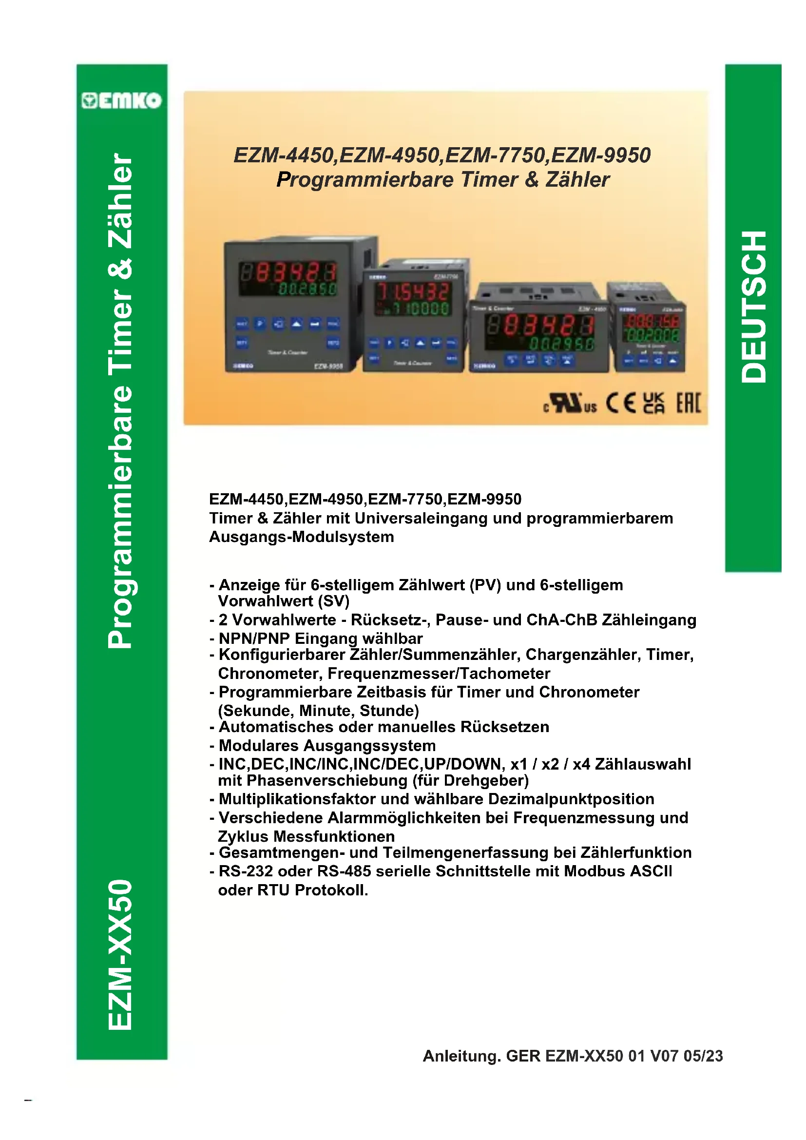 Timer & Zähler mit Universaleingang und programmierbarem Ausgangs-Modulsystem Anleitung. GER EZM-XX50 01 V07 05/23SPEZIFIKATION: EINGÄNGE: Zähleingänge (Ch-A,Ch-B): Schalter, Näherungsschalter,Kapazitivsensor oder Drehgeber Rücksetzeingang: Schalter, Näherungsschalter, Kapazitivsensor oder Drehgeber Pauseeingang: Schalter, Näherungsschalter, Kapazitivsensor oder Drehgeber Sensortyp: NPN oder PNP Rücksetzfunktion: automatisch oder manuell Zähleingänge und maximale Frequenzen: INC,DEC,INC/INC,INC/DEC,UP/DOWN x1 / x2 / x4: Phasen-verschiebung (Drehgeber) AUSGÄNGE Ausgabemodule: 2 Ausgänge wahlweise Relais, SSR oder Transistor - Relais 3 A @ 250 VV - SSR max. 20mA @ 18 VZ - Transistor max. 40mA @18 VZ ANZEIGE Anzeige für den aktuellen Wert: EZM-4450: 8 mm rote 6-stellige LED-Anzeige EZM-4950: 13.2 mm rote 6-stellige LED-Anzeige EZM-7750: 10.8 mm rote 6-stellige LED-Anzeige EZM-9950: 13.2 mm rote 6-stellige LED-Anzeige Anzeige für Set-Wert: EZM-4450: 8 mm grüne 6-stellige LED-Anzeige EZM-4950: 8 mm grüne 6-stellige LED-Anzeige EZM-7750: 8 mm grüne 6-stellige LED-Anzeige EZM-9950: 8 mm grüne 6-stellige LED-Anzeige LED-Anzeigen : Vorwahlwert 1/2; Ausgang 1/2 VERSORGUNG Versorgungsspannung : 100-240 V 50/60 Hz (-15%;+10%) 6VA 24 VV 50/60 Hz (-15% ; +10%) 6VA 24 VZ (-15% ; +10%) 6W (Bei Bestellung angeben)