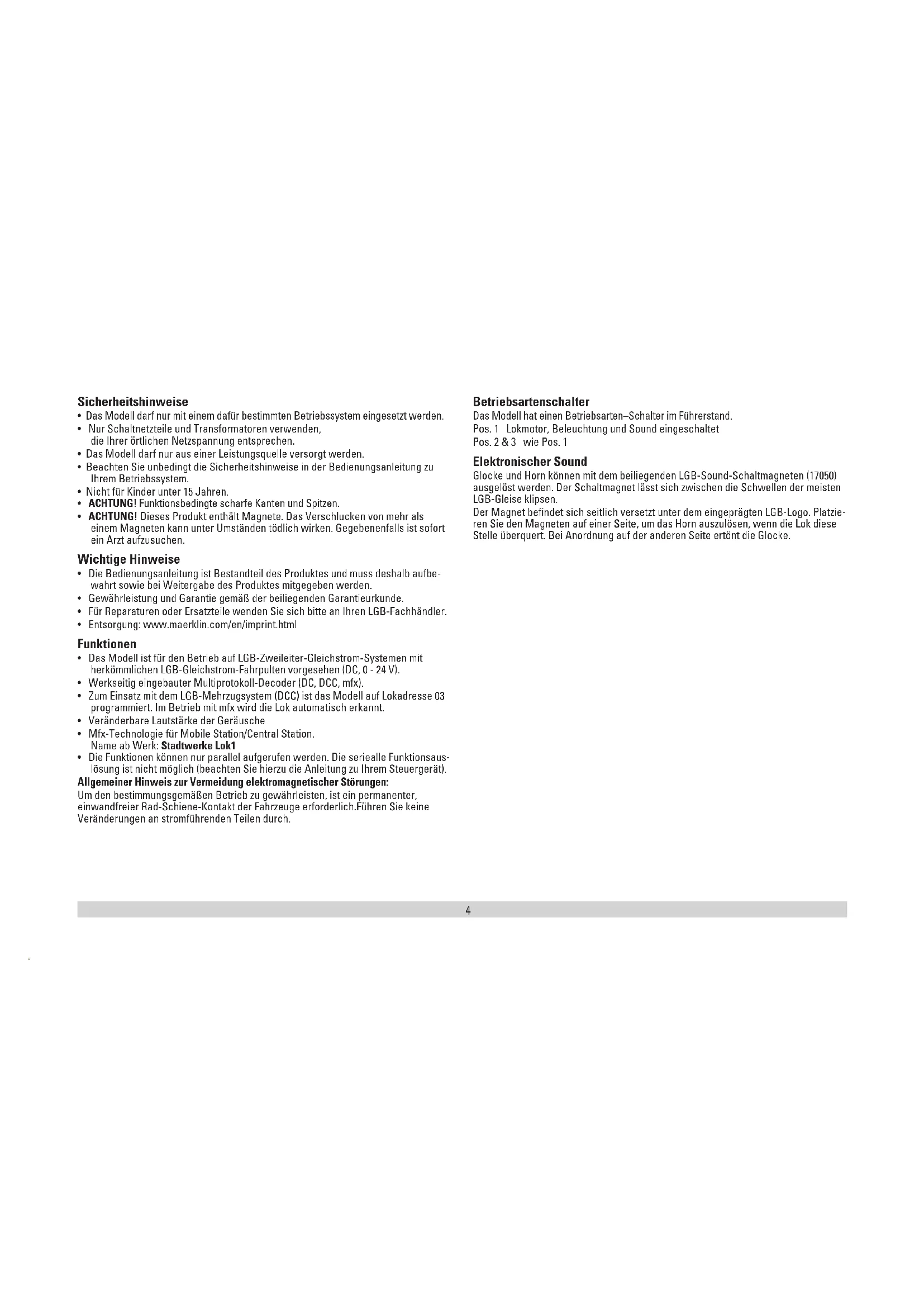 - Die Funktionen können nur parallel aufgerufen werden. Die seriealle Funktionsaus- lösung ist nicht möglich (beachten Sie hierzu die Anleitung zu Ihrem Steuergerät). Allgemeiner Hinweis zur Vermeidung elektromagnetischer Störungen: Um den bestimmungsgemäßen Betrieb zu gewährleisten, ist ein permanenter, einwandfreier Rad-Schiene-Kontakt der Fahrzeuge erforderlich.Führen Sie keine Veränderungen an stromführenden Teilen durch. Betriebsartenschalter Das Modell hat einen Betriebsarten–Schalter im Führerstand. Pos. 1 Lokmotor, Beleuchtung und Sound eingeschaltet Pos. 2 & 3 wie Pos. 1 Elektronischer Sound Glocke und Horn können mit dem beiliegenden LGB-Sound-Schaltmagneten (17050) ausgelöst werden. Der Schaltmagnet lässt sich zwischen die Schwellen der meisten LGB-Gleise klipsen. Der Magnet befindet sich seitlich versetzt unter dem eingeprägten LGB-Logo. Platzie- ren Sie den Magneten auf einer Seite, um das Horn auszulösen, wenn die Lok diese Stelle überquert. Bei Anordnung auf der anderen Seite ertönt die Glocke.5 Multiprotokollbetrieb Analogbetrieb Der Decoder kann auch auf analogen Anlagen oder Gleisabschnitten betrieben wer- den. Der Decoder erkennt die analoge Gleichspannung (DC) automatisch und passt sich der analogen Gleisspannung an. Es sind alle Funktionen, die unter mfx oder DCC für den Analogbetrieb eingestellt wurden aktiv (siehe Digitalbetrieb). Die Eingebauten Sound-Funktionen sind ab Werk im Analogbetrieb nicht aktiv. Digitalbetrieb Der Decoder ist ein Multiprotokolldecoder. Der Decoder kann unter folgenden Digital- Protokollen eingesetzt werden: mfx oder DCC. Das Digital-Protokoll mit den meisten Möglichkeiten ist das höchstwertige Digital- Protokoll. Die Reihenfolge der Digital-Protokolle ist in der Wertung fallend: Priorität 1: mfx; Priorität 2: DCC; Priorität 3: DC Hinweis: Digital-Protokolle können sich gegenseitig beeinflussen. Für einen stö- rungsfreien Betrieb empfehlen wir, nicht benötigte Digital-Protokolle mit Configura- tions Variable (CV) 50 zu deaktivieren. Deaktivieren Sie, sofern dies Ihre Zentrale unterstützt, auch dort die nicht benötigten Digital-Protokolle. Werden zwei oder mehrere Digital-Protokolle am Gleis erkannt, übernimmt der De- coder automatisch das höchstwertige Digital-Protokoll, z.B. mfx/DCC, somit wird das mfx-Digital-Protokoll vom Decoder übernommen. Hinweis: Beachten Sie, dass nicht alle Funktionen in allen Digital-Protokollen möglich sind. Unter mfx und DCC können einige Einstellungen von Funktionen, welche im Analog-Betrieb wirksam sein sollen, vorgenommen werden. Hinweise zum Digitalbetrieb