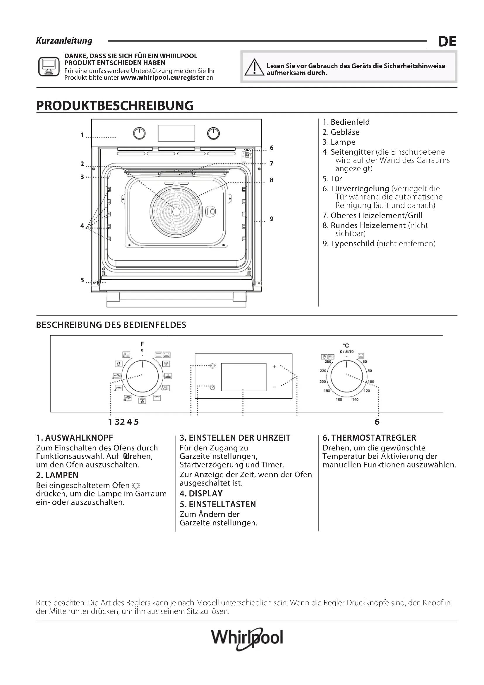 Kurzanleitung DANKE, DASS SIE SICH FÜR EIN WHIRLPOOL PRODUKT ENTSCHIEDEN HABENFür eine umfassendere Unterstützung melden Sie Ihr Produkt bitte unter www.whirlpool.eu/register anLesen Sie vor Gebrauch des Geräts die Sicherheitshinweise aufmerksam durch. PRODUKTBESCHREIBUNG