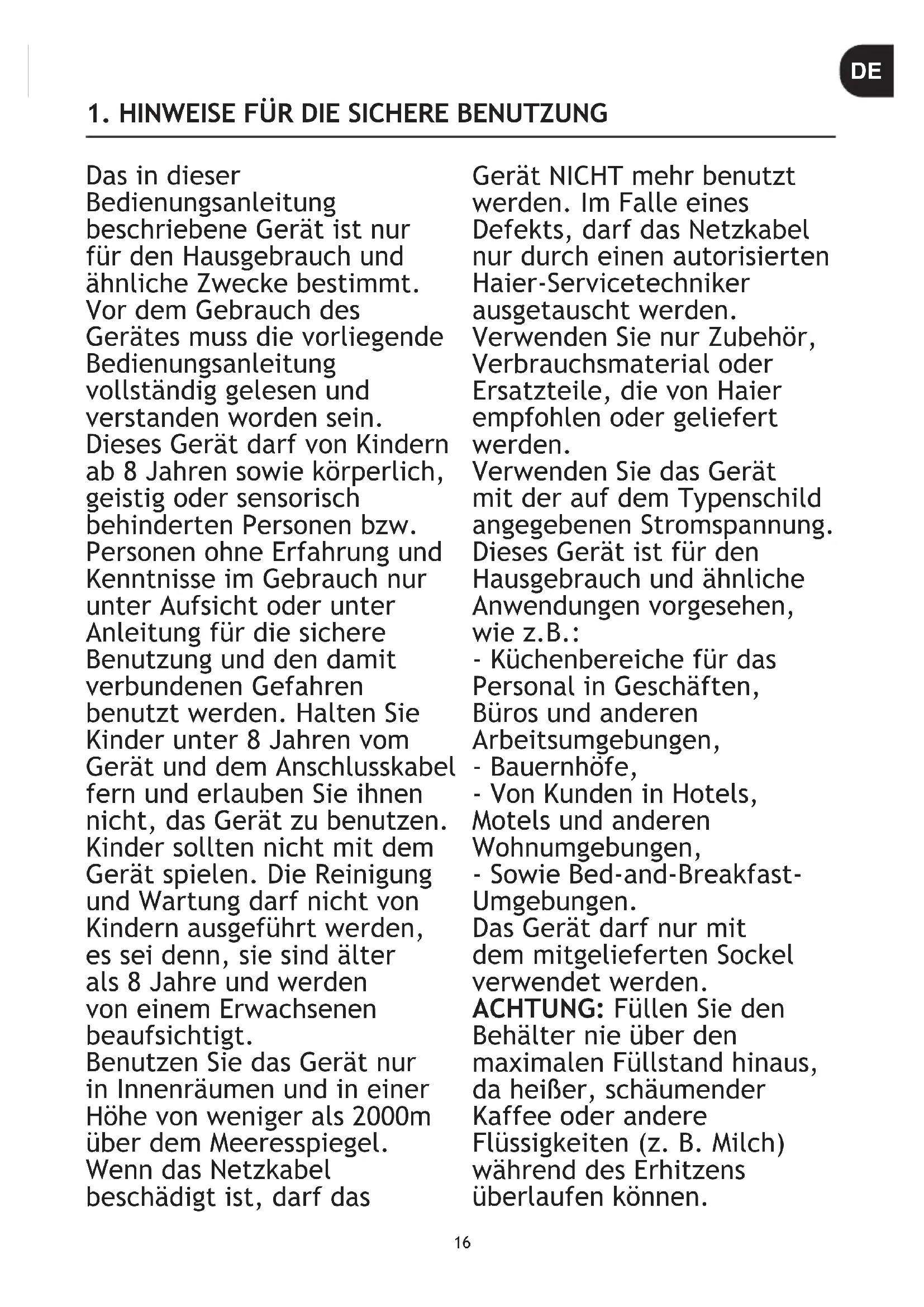 - Le contenu peut varier en fonction de votre modèle. FR16 Das in dieser Bedienungsanleitung beschriebene Gerät ist nur für den Hausgebrauch und ähnliche Zwecke bestimmt. Vor dem Gebrauch des Gerätes muss die vorliegende Bedienungsanleitung vollständig gelesen und verstanden worden sein. Dieses Gerät darf von Kindern ab 8 Jahren sowie körperlich, geistig oder sensorisch behinderten Personen bzw. Personen ohne Erfahrung und Kenntnisse im Gebrauch nur unter Aufsicht oder unter Anleitung für die sichere Benutzung und den damit verbundenen Gefahren benutzt werden. Halten Sie Kinder unter 8 Jahren vom Gerät und dem Anschlusskabel fern und erlauben Sie ihnen nicht, das Gerät zu benutzen. Kinder sollten nicht mit dem Gerät spielen. Die Reinigung und Wartung darf nicht von Kindern ausgeführt werden, es sei denn, sie sind älter als 8 Jahre und werden von einem Erwachsenen beaufsichtigt. Benutzen Sie das Gerät nur in Innenräumen und in einer Höhe von weniger als 2000m über dem Meeresspiegel. Wenn das Netzkabel beschädigt ist, darf das Gerät NICHT mehr benutzt werden. Im Falle eines Defekts, darf das Netzkabel nur durch einen autorisierten Haier-Servicetechniker ausgetauscht werden. Verwenden Sie nur Zubehör, Verbrauchsmaterial oder Ersatzteile, die von Haier empfohlen oder geliefert werden. Verwenden Sie das Gerät mit der auf dem Typenschild angegebenen Stromspannung. Dieses Gerät ist für den Hausgebrauch und ähnliche Anwendungen vorgesehen, wie z.B.: - Küchenbereiche für das Personal in Geschäften, Büros und anderen Arbeitsumgebungen, - Bauernhöfe, - Von Kunden in Hotels, Motels und anderen Wohnumgebungen, - Sowie Bed-and-Breakfast- Umgebungen. Das Gerät darf nur mit dem mitgelieferten Sockel verwendet werden. ACHTUNG: Füllen Sie den Behälter nie über den maximalen Füllstand hinaus, da heißer, schäumender Kaffee oder andere Flüssigkeiten (z. B. Milch) während des Erhitzens überlaufen können.