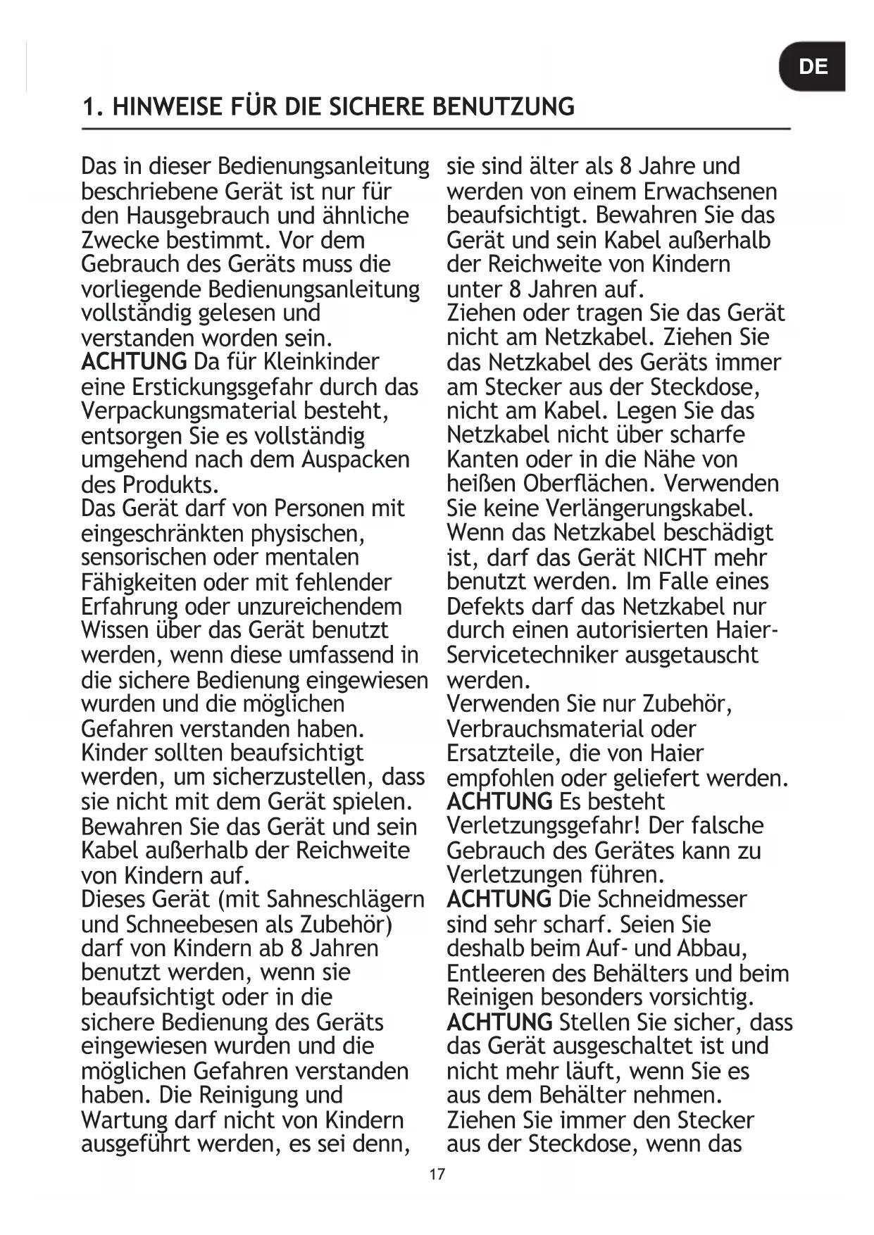 fonctionnement. Laissez que l’unité se refroidisse avant de l’utiliser à nouveau.17 Das in dieser Bedienungsanleitung beschriebene Gerät ist nur für den Hausgebrauch und ähnliche Zwecke bestimmt. Vor dem Gebrauch des Geräts muss die vorliegende Bedienungsanleitung vollständig gelesen und verstanden worden sein. ACHTUNG Da für Kleinkinder eine Erstickungsgefahr durch das Verpackungsmaterial besteht, entsorgen Sie es vollständig umgehend nach dem Auspacken des Produkts. Das Gerät darf von Personen mit eingeschränkten physischen, sensorischen oder mentalen Fähigkeiten oder mit fehlender Erfahrung oder unzureichendem Wissen über das Gerät benutzt werden, wenn diese umfassend in die sichere Bedienung eingewiesen wurden und die möglichen Gefahren verstanden haben. Kinder sollten beaufsichtigt werden, um sicherzustellen, dass sie nicht mit dem Gerät spielen. Bewahren Sie das Gerät und sein Kabel außerhalb der Reichweite von Kindern auf. Dieses Gerät (mit Sahneschlägern und Schneebesen als Zubehör) darf von Kindern ab 8 Jahren benutzt werden, wenn sie beaufsichtigt oder in die sichere Bedienung des Geräts eingewiesen wurden und die möglichen Gefahren verstanden haben. Die Reinigung und Wartung darf nicht von Kindern ausgeführt werden, es sei denn, sie sind älter als 8 Jahre und werden von einem Erwachsenen beaufsichtigt. Bewahren Sie das Gerät und sein Kabel außerhalb der Reichweite von Kindern unter 8 Jahren auf. Ziehen oder tragen Sie das Gerät nicht am Netzkabel. Ziehen Sie das Netzkabel des Geräts immer am Stecker aus der Steckdose, nicht am Kabel. Legen Sie das Netzkabel nicht über scharfe Kanten oder in die Nähe von heißen Oberächen. Verwenden Sie keine Verlängerungskabel. Wenn das Netzkabel beschädigt ist, darf das Gerät NICHT mehr benutzt werden. Im Falle eines Defekts darf das Netzkabel nur durch einen autorisierten Haier- Servicetechniker ausgetauscht werden. Verwenden Sie nur Zubehör, Verbrauchsmaterial oder Ersatzteile, die von Haier empfohlen oder geliefert werden. ACHTUNG Es besteht Verletzungsgefahr! Der falsche Gebrauch des Gerätes kann zu Verletzungen führen. ACHTUNG Die Schneidmesser sind sehr scharf. Seien Sie deshalb beim Auf- und Abbau, Entleeren des Behälters und beim Reinigen besonders vorsichtig. ACHTUNG Stellen Sie sicher, dass das Gerät ausgeschaltet ist und nicht mehr läuft, wenn Sie es aus dem Behälter nehmen. Ziehen Sie immer den Stecker aus der Steckdose, wenn das