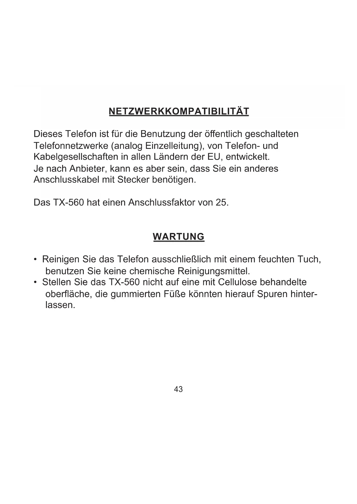 Commaxx B.V., Wiebachstraat 37, 6466 NG, Kerkrade, The Netherlands41 GEBRAUCHSANWEISUNG TX-5604243 NETZWERKKOMPATIBILITÄT Dieses Telefon ist für die Benutzung der öentlich geschalteten Telefonnetzwerke (analog Einzelleitung), von Telefon- und Kabelgesellschaften in allen Ländern der EU, entwickelt. Je nach Anbieter, kann es aber sein, dass Sie ein anderes Anschlusskabel mit Stecker benötigen. Das TX-560 hat einen Anschlussfaktor von 25. WARTUNG