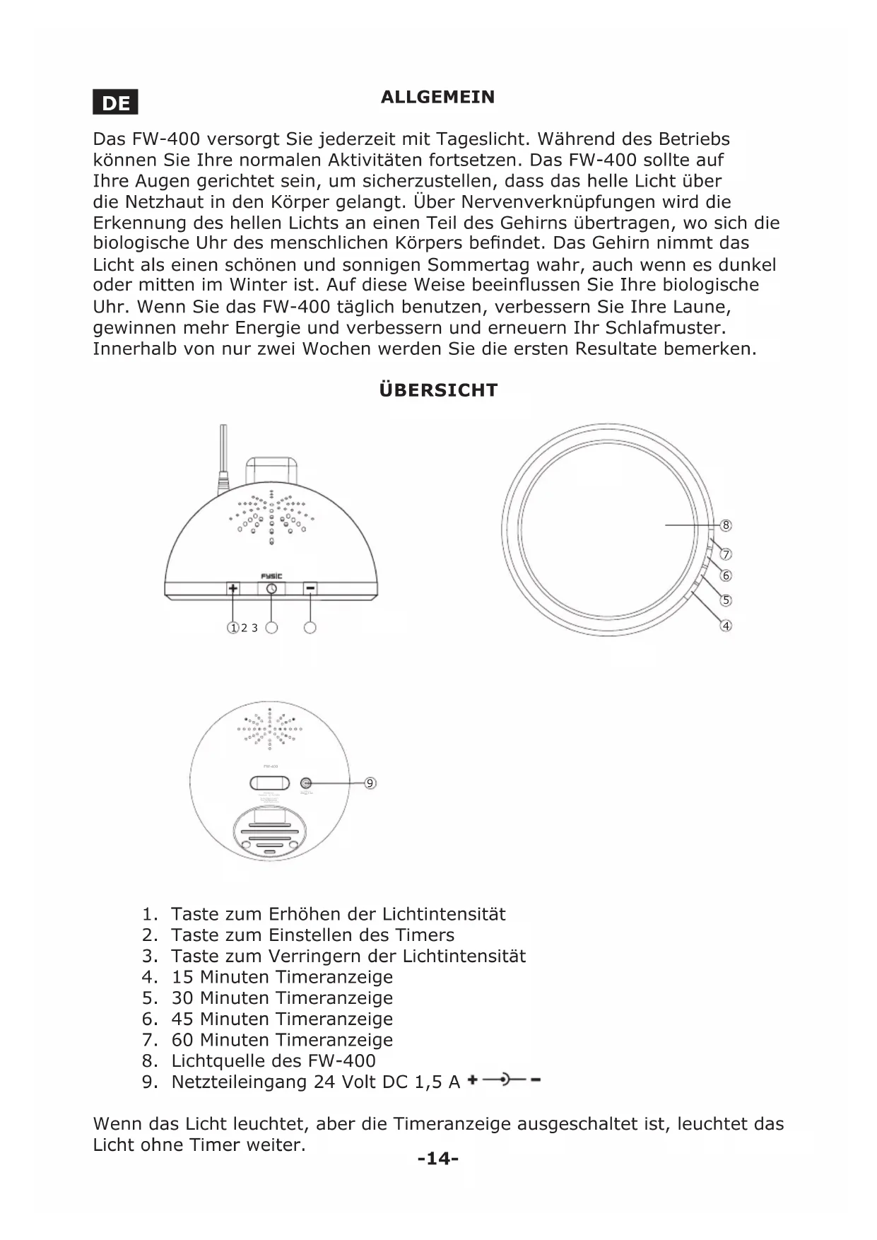 - L’application de luminothérapie le matin est recommandée car l’utilisation le matin est plus positive qu’à d’autres moments.-14- ALLGEMEIN Das FW-400 versorgt Sie jederzeit mit Tageslicht. Während des Betriebs können Sie Ihre normalen Aktivitäten fortsetzen. Das FW-400 sollte auf Ihre Augen gerichtet sein, um sicherzustellen, dass das helle Licht über die Netzhaut in den Körper gelangt. Über Nervenverknüpfungen wird die Erkennung des hellen Lichts an einen Teil des Gehirns übertragen, wo sich die biologische Uhr des menschlichen Körpers bendet. Das Gehirn nimmt das Licht als einen schönen und sonnigen Sommertag wahr, auch wenn es dunkel oder mitten im Winter ist. Auf diese Weise beeinussen Sie Ihre biologische Uhr. Wenn Sie das FW-400 täglich benutzen, verbessern Sie Ihre Laune, gewinnen mehr Energie und verbessern und erneuern Ihr Schlafmuster. Innerhalb von nur zwei Wochen werden Sie die ersten Resultate bemerken. ÜBERSICHT