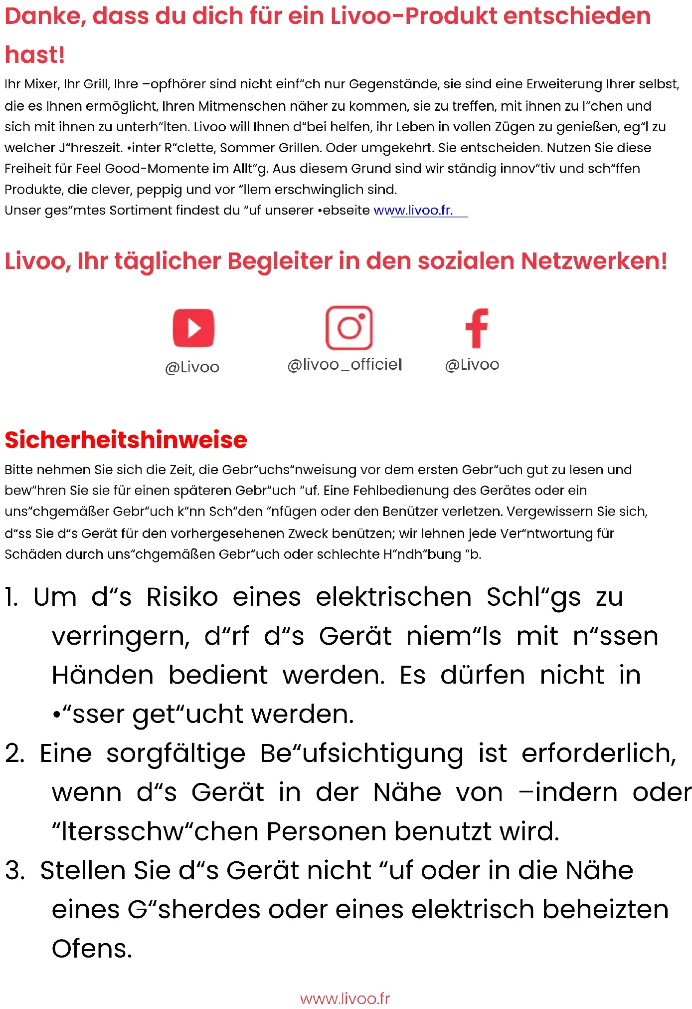 DEwww.livoo.fr Danke, dass du dich für ein Livoo-Produkt entschieden hast! Ihr Mixer, Ihr Grill, Ihre Kopfhörer sind nicht einfach nur Gegenstände, sie sind eine Erweiterung Ihrer selbst, die es Ihnen ermöglicht, Ihren Mitmenschen näher zu kommen, sie zu treffen, mit ihnen zu lachen und sich mit ihnen zu unterhalten. Livoo will Ihnen dabei helfen, ihr Leben in vollen Zügen zu genießen, egal zu welcher Jahreszeit. Winter Raclette, Sommer Grillen. Oder umgekehrt. Sie entscheiden. Nutzen Sie diese Freiheit für Feel Good-Momente im Alltag. Aus diesem Grund sind wir ständig innovativ und schaffen Produkte, die clever, peppig und vor allem erschwinglich sind. Unser gesamtes Sortiment findest du auf unserer Webseite www.livoo.fr. Livoo, Ihr täglicher Begleiter in den sozialen Netzwerken!