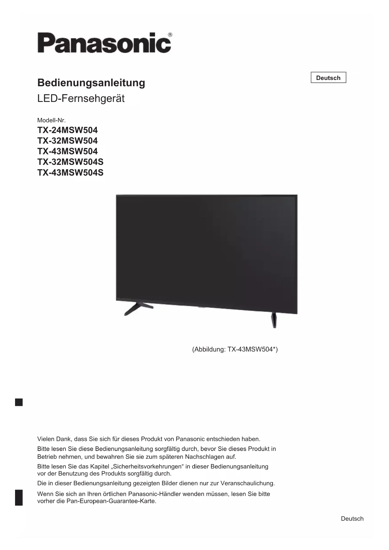 Bedienungsanleitung LED-Fernsehgerät Deutsch Vielen Dank, dass Sie sich für dieses Produkt von Panasonic entschieden haben. Bitte lesen Sie diese Bedienungsanleitung sorgfältig durch, bevor Sie dieses Produkt in Betrieb nehmen, und bewahren Sie sie zum späteren Nachschlagen auf. Bitte lesen Sie das Kapitel „Sicherheitsvorkehrungen“ in dieser Bedienungsanleitung vor der Benutzung des Produkts sorgfältig durch. Die in dieser Bedienungsanleitung gezeigten Bilder dienen nur zur Veranschaulichung. Wenn Sie sich an Ihren örtlichen Panasonic-Händler wenden müssen, lesen Sie bitte vorher die Pan-European-Guarantee-Karte. (Abbildung: TX-43MSW504*) DeutschDeutsch