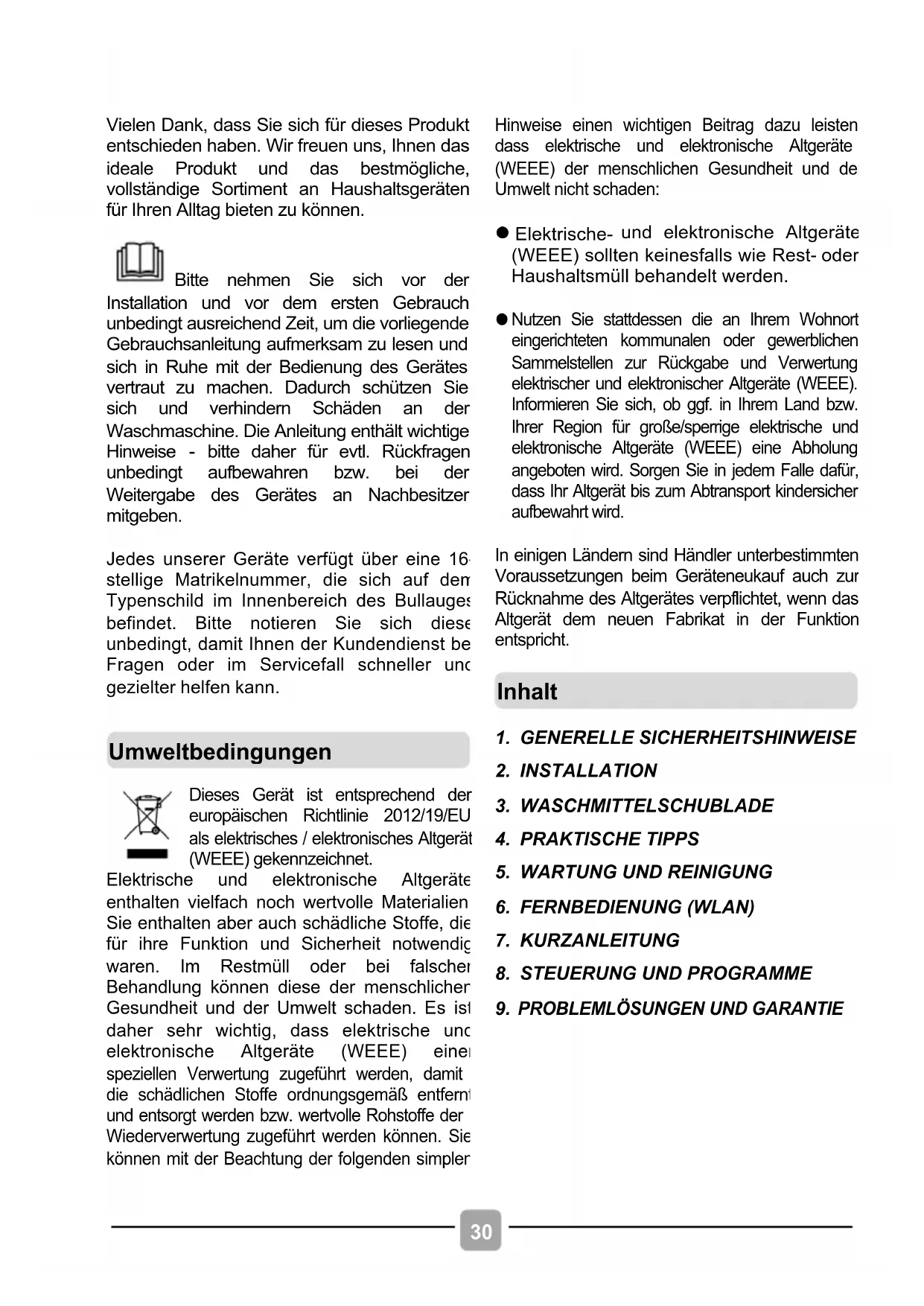 Bitte nehmen Sie sich vor der Installation und vor dem ersten Gebrauch unbedingt ausreichend Zeit, um die vorliegende Gebrauchsanleitung aufmerksam zu lesen und sich in Ruhe mit der Bedienung des Gerätes vertraut zu machen. Dadurch schützen Sie sich und verhindern Schäden an der Waschmaschine. Die Anleitung enthält wichtige Hinweise