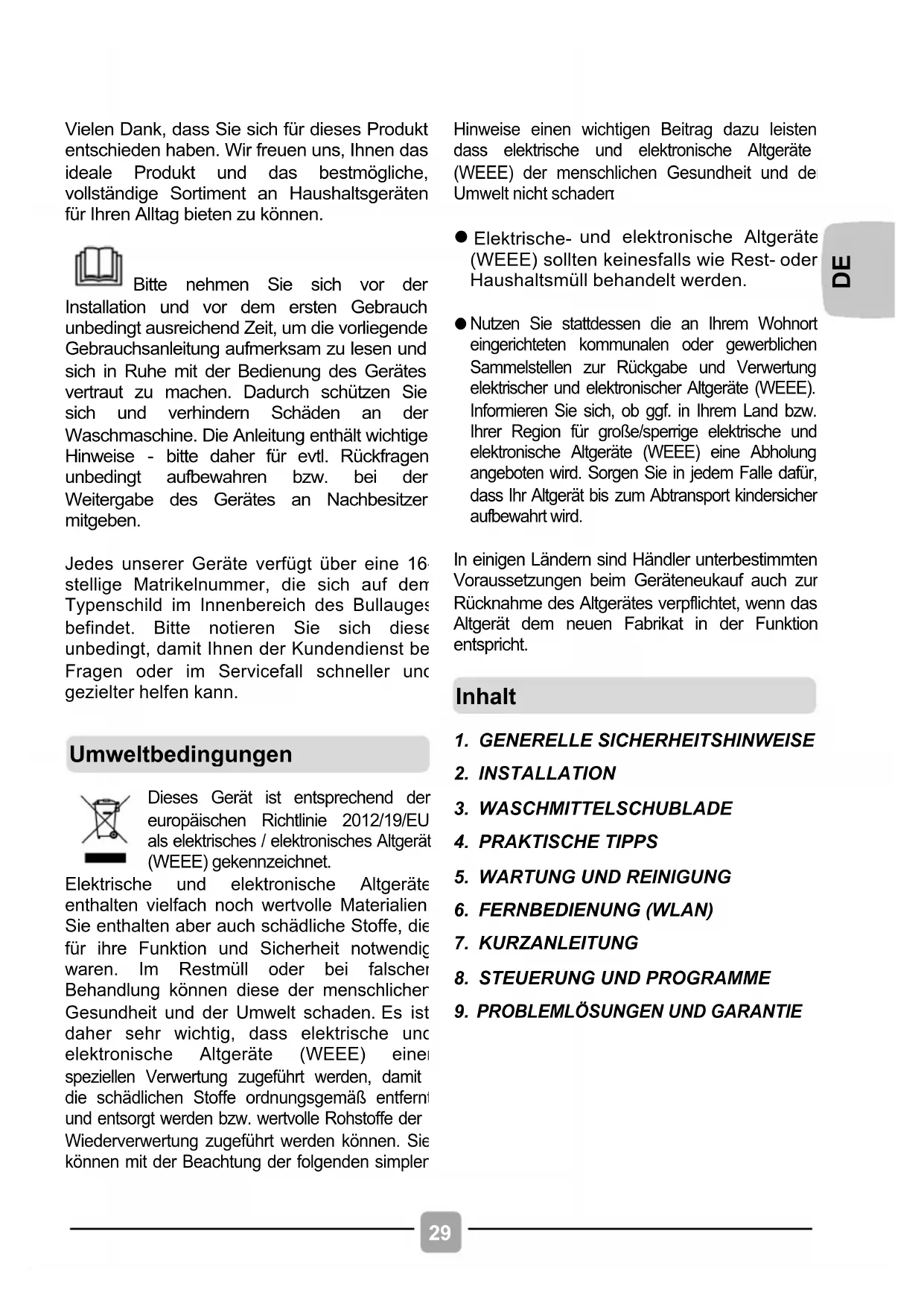 Bitte nehmen Sie sich vor der Installation und vor dem ersten Gebrauch unbedingt ausreichend Zeit, um die vorliegende Gebrauchsanleitung aufmerksam zu lesen und sich in Ruhe mit der Bedienung des Gerätes vertraut zu machen. Dadurch schützen Sie sich und verhindern Schäden an der Waschmaschine. Die Anleitung enthält wichtige Hinweise