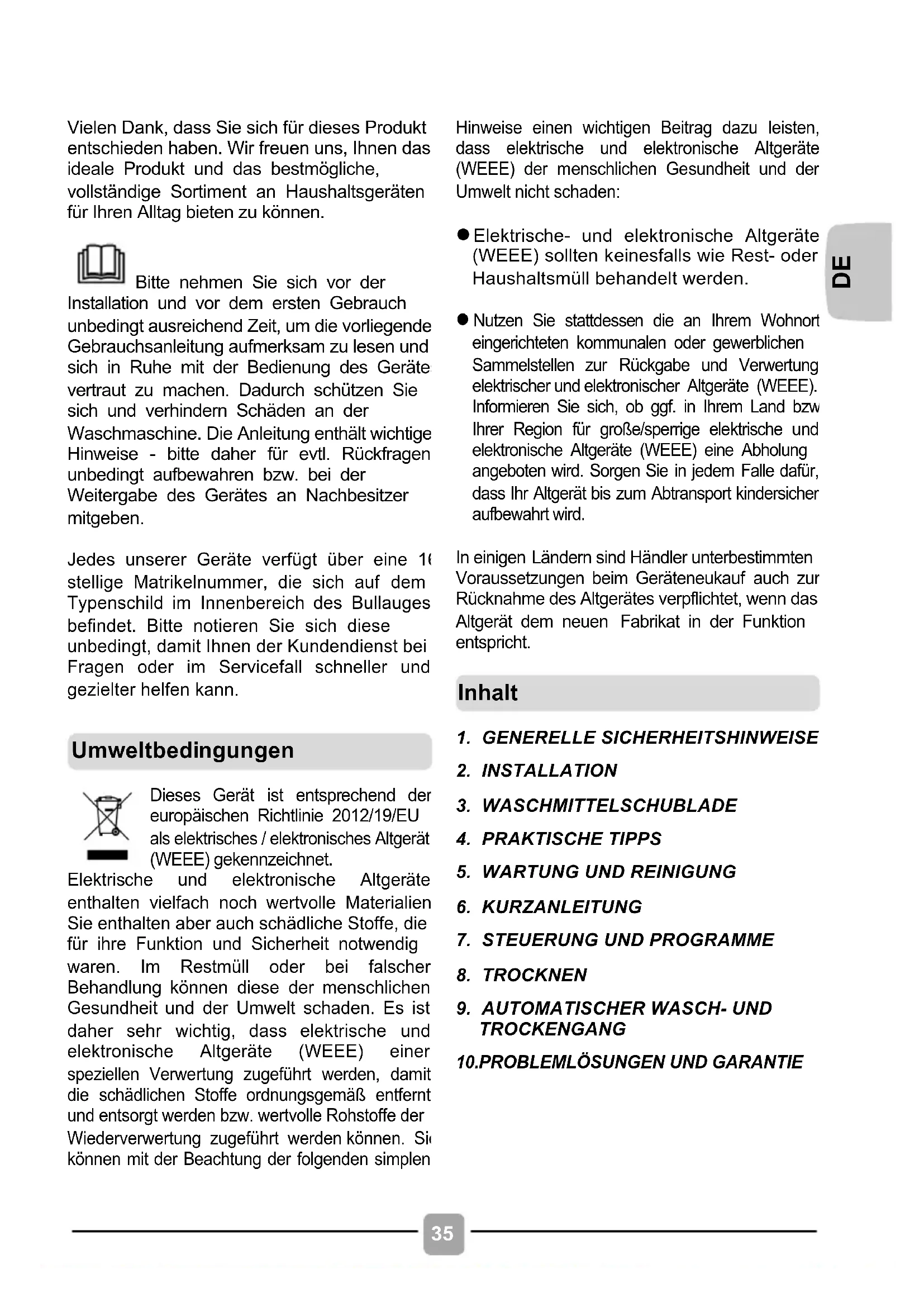 Vielen Dank, dass Sie sich für dieses Produkt entschieden haben. Wir freuen uns, Ihnen das ideale Produkt und das bestmögliche, vollständige Sortiment an Haushaltsgeräten für Ihren Alltag bieten zu können. Bitte nehmen Sie sich vor der Installation und vor dem ersten Gebrauch unbedingt ausreichend Zeit, um die vorliegende Gebrauchsanleitung aufmerksam zu lesen und sich in Ruhe mit der Bedienung des Gerätes vertraut zu machen. Dadurch schützen Sie sich und verhindern Schäden an der Waschmaschine. Die Anleitung enthält wichtige Hinweise - bitte daher für evtl. Rückfragen unbedingt aufbewahren bzw. bei der Weitergabe des Gerätes an Nachbesitzer mitgeben. Jedes unserer Geräte verfügt über eine 16- stellige Matrikelnummer, die sich auf dem Typenschild im Innenbereich des Bullauges befindet. Bitte notieren Sie sich diese unbedingt, damit Ihnen der Kundendienst bei Fragen oder im Servicefall schneller und gezielter helfen kann.