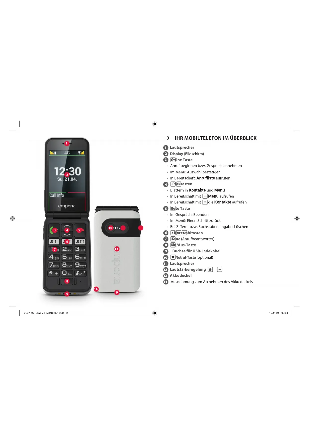 V227-4G_BDA-V1_55916-001.indb 13V227-4G_BDA-V1_55916-001.indb 13 19.11.21 09:5419.11.21 09:54DEUTSCH–14 › Menüpunkte: Mobilfunknetz, Lautlos/Schlafen, TöneundSignale, Hörerlautstärke, Freisprechlautstärke, BildschirmundBeleuchtung, ZeitundDatum, Sprache, Anklopfen, Rufumleitung, AufklappenfürAnrufannahme, RufNr.unterdrücken, Nr.Anrufbeantworter, Notrufkontakte, Notruftaste, Sicherheitseinstellungen, Kontakteinstellungen, 0000fürEinstellungen, Systemaktualisierung, Rücksetzen