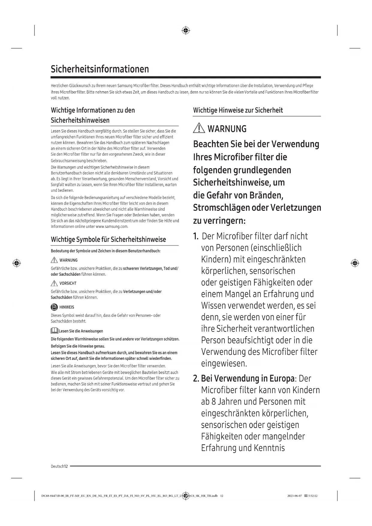 - The dimensions stated here may differ slightly from the actual measurements depending on the measuring method. DC68-04471B-00_IB_FT-MF_EU_EN_DE_NL_FR_IT_ES_PT_DA_FI_NO_SV_PL_HU_EL_RO_BG_LT_LV_ET_CS_SK_HR_TR.indb 11 2023-06-07 5:52:11Deutsch12 Sicherheitsinformationen Herzlichen Glückwunsch zu Ihrem neuen Samsung Microfiber filter. Dieses Handbuch enthält wichtige Informationen über die Installation, Verwendung und Pflege Ihres Microfiber filter. Bitte nehmen Sie sich etwas Zeit, um dieses Handbuch zu lesen, denn nur so können Sie die vielen Vorteile und Funktionen Ihres Microfiber filter voll nutzen. Wichtige Informationen zu den Sicherheitshinweisen Lesen Sie dieses Handbuch sorgfältig durch. So stellen Sie sicher, dass Sie die umfangreichen Funktionen Ihres neuen Microfiber filter sicher und effizient nutzen können. Bewahren Sie das Handbuch zum späteren Nachschlagen an einem sicheren Ort in der Nähe des Microfiber filter auf. Verwenden Sie den Microfiber filter nur für den vorgesehenen Zweck, wie in dieser Gebrauchsanweisung beschrieben. Die Warnungen und wichtigen Sicherheitshinweise in diesem Benutzerhandbuch decken nicht alle denkbaren Umstände und Situationen ab. Es liegt in Ihrer Verantwortung, gesunden Menschenverstand, Vorsicht und Sorgfalt walten zu lassen, wenn Sie Ihren Microfiber filter installieren, warten und bedienen. Da sich die folgende Bedienungsanleitung auf verschiedene Modelle bezieht, können die Eigenschaften Ihres Microfiber filter leicht von den in diesem Handbuch beschriebenen abweichen und nicht alle Warnhinweise sind möglicherweise zutreffend. Wenn Sie Fragen oder Bedenken haben, wenden Sie sich an das nächstgelegene Kundendienstzentrum oder finden Sie Hilfe und Informationen online unter www.samsung.com. Wichtige Symbole für Sicherheitshinweise Bedeutung der Symbole und Zeichen in diesem Benutzerhandbuch: WARNUNG Gefährliche bzw. unsichere Praktiken, die zu schweren Verletzungen, Tod und/ oder Sachschäden führen können. VORSICHT Gefährliche bzw. unsichere Praktiken, die zu Verletzungen und/oder Sachschäden führen können. HINWEIS Dieses Symbol weist darauf hin, dass die Gefahr von Personen- oder Sachschäden besteht. Lesen Sie die Anweisungen Die folgenden Warnhinweise sollen Sie und andere vor Verletzungen schützen. Befolgen Sie die Hinweise genau. Lesen Sie dieses Handbuch aufmerksam durch, und bewahren Sie es an einem sicheren Ort auf, damit Sie die Informationen später schnell wiederfinden. Lesen Sie alle Anweisungen, bevor Sie den Microfiber filter verwenden. Wie alle mit Strom betriebenen Geräte mit beweglichen Bauteilen besitzt auch dieses Gerät ein gewisses Gefahrenpotenzial. Um den Microfiber filter sicher zu bedienen, machen Sie sich mit seiner Funktionsweise vertraut und gehen Sie bei der Verwendung des Geräts vorsichtig vor. Wichtige Hinweise zur Sicherheit WARNUNG Beachten Sie bei der Verwendung Ihres Microfiber filter die folgenden grundlegenden Sicherheitshinweise, um die Gefahr von Bränden, Stromschlägen oder Verletzungen zu verringern: