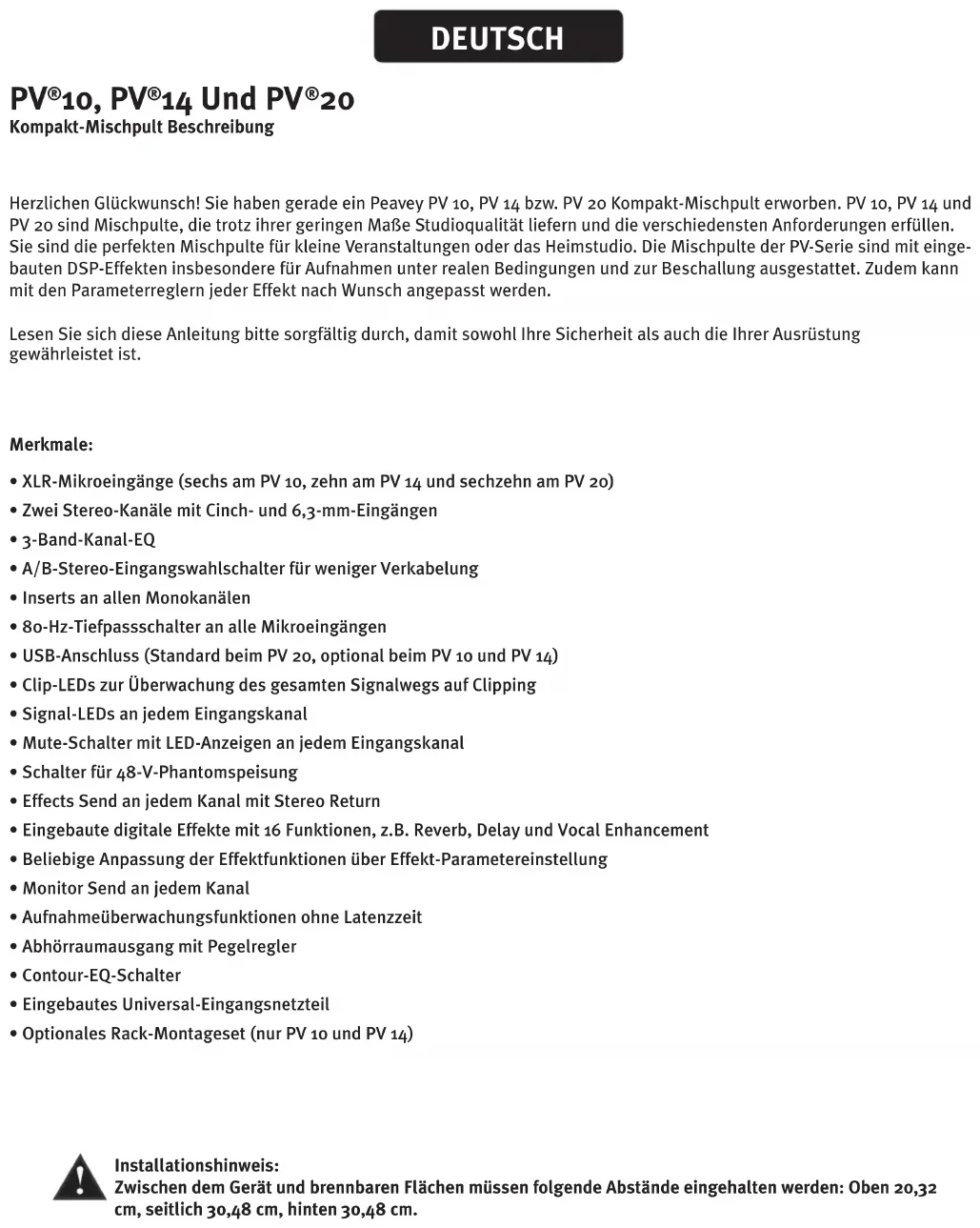 Kompakt-Mischpult Beschreibung Herzlichen Glückwunsch! Sie haben gerade ein Peavey PV 10, PV 14 bzw. PV 20 Kompakt-Mischpult erworben. PV 10, PV 14 und PV 20 sind Mischpulte, die trotz ihrer geringen Maße Studioqualität liefern und die verschiedensten Anforderungen erfüllen. Sie sind die perfekten Mischpulte für kleine Veranstaltungen oder das Heimstudio. Die Mischpulte der PV-Serie sind mit einge- bauten DSP-Effekten insbesondere für Aufnahmen unter realen Bedingungen und zur Beschallung ausgestattet. Zudem kann mit den Parameterreglern jeder Effekt nach Wunsch angepasst werden. Lesen Sie sich diese Anleitung bitte sorgfältig durch, damit sowohl Ihre Sicherheit als auch die Ihrer Ausrüstung gewährleistet ist. Merkmale: