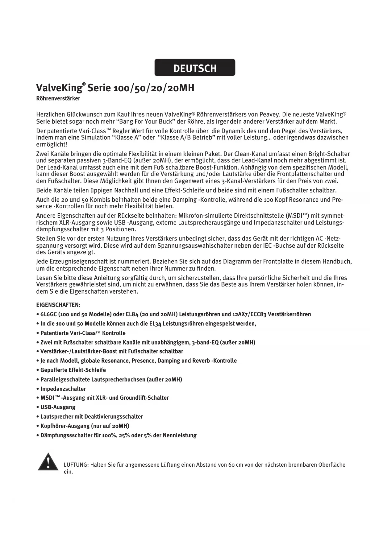 Entzerrung: (Nur Clean-Kanal) Einstellung Niedriger, Mittlerer & Hoher passiver EQ Hell Drücken: +6dB @ ~3.5kHz Entzerrung: (Lead-Kanal und 20MH) Einstellung Niedriger, Mittlerer & Hoher passiver EQ Lead-Kanal Frontplatte Fußschalter-Funktionen: Verstärkung Drücken: Erhöht die Verstärkung im Lead-Kanal und führt einen strafferen Frequenzgang am unteren Ende ein. Lautstärke Drücken: +3-5dB Laustärkeanhebung (mehr Effekt bei Lead-Laut-Einstellungen in der Mitte) Externe(r) Fußschalter: (optional) Ein oder zwei dual-verriegelte Fußschalter. Ein Fußschalter zur Kanalauswahl und für Volume Boost und/oder Gain Boost-Funktionen, die auf den zuvor beschriebenen GAIN (8) und VOLUME-Schaltern (9) auf der Frontplatte voreingestellt wurden. Ein zweiter Fußschalter kann zum ein- und ausschalten von REVERB und EFFECTS LOOP verwendet werden. Sonstige Daten Abstand Signal zur Geräusch: Besser als 74dB auf allen Modellen (verglichen zur vollen Leistung) MSDI™ Ausgang: Niedrige Impedanz: 600Ω Symmetrisch Ausgangspegel: Je nach Regler aber -12dBu (+/- 3dBu) bei voller Leistung auf allen Modellen USB-Ausgang: Ausgangspegel: Je nach Regler aber -6dB (+/- 3dB) bei voller Leistung auf allen Modellen Leistungsdämpfungsglied: Drei Stellschalter 100% (überbrückt), 25% und 5% der Nennleistung Kopfhörerausgang: (nur 20MH) Stereo Mini-Buchse mit gefiltertem Ausgang für das Steuern von Kopfhörern,16Ω - 50Ω Impedanz pro Kanal. Merkmale und Spezifikationen können ohne vorherige Bekanntmachung verändert werden.Serie ValveKing