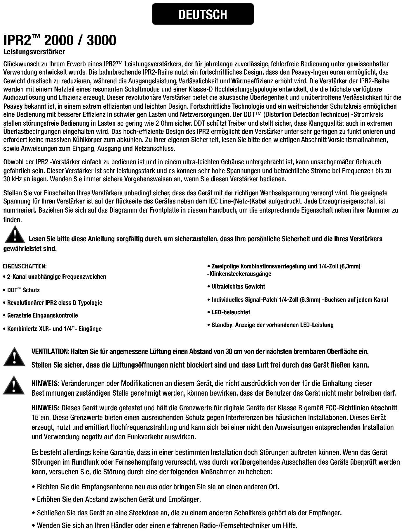 2000 / 3000 Leistungsverstärker Glückwunsch zu Ihrem Erwerb eines IPR2™ Leistungsverstärkers, der für jahrelange zuverlässige, fehlerfreie Bedienung unter gewissenhafter Verwendung entwickelt wurde. Die bahnbrechende IPR2-Reihe nutzt ein fortschrittliches Design, dass den Peavey-Ingenieuren ermöglicht, das Gewicht drastisch zu reduzieren, während die Ausgangsleistung, Verlässlichkeit und Wärmeeffizienz erhöht wird. Die Verstärker der IPR2-Reihe werden mit einem Netzteil eines resonanten Schaltmodus und einer Klasse-D Hochleistungstypologie entwickelt, die die höchste verfügbare Audioauflösung und Effizienz erzeugt. Dieser revolutionäre Verstärker bietet die akustische Überlegenheit und unübertroffene Verlässlichkeit für die Peavey bekannt ist, in einem extrem effizienten und leichten Design. Fortschrittliche Technologie und ein weitreichender Schutzkreis ermöglichen eine Bedienung mit besserer Effizienz in schwierigen Lasten und Netzversorgungen. Der DDT™ (Distortion Detection Technique) -Stromkreis stellen störungsfreie Bedienung in Lasten so gering wie 2 Ohm sicher. DDT schützt Treiber und stellt sicher, dass Klangqualität auch in extremen Überlastbedingungen eingehalten wird. Das hoch-effiziente Design des IPR2 ermöglicht dem Verstärker unter sehr geringen zu funktionieren und erfordert keine massiven Kühlkörper zum abkühlen. Zu Ihrer eigenen Sicherheit, lesen Sie bitte den wichtigen Abschnitt Vorsichtsmaßnahmen, sowie Anweisungen zum Eingang, Ausgang und Netzanschluss. Obwohl der IPR2 -Verstärker einfach zu bedienen ist und in einem ultra-leichten Gehäuse untergebracht ist, kann unsachgemäßer Gebrauch gefährlich sein. Dieser Verstärker ist sehr leistungsstark und es können sehr hohe Spannungen und beträchtliche Ströme bei Frequenzen bis zu 30 kHz anliegen. Wenden Sie immer sichere Vorgehensweisen an, wenn Sie diesen Verstärker bedienen. Stellen Sie vor Einschalten Ihres Verstärkers unbedingt sicher, dass das Gerät mit der richtigen Wechselspannung versorgt wird. Die geeignete Spannung für Ihren Verstärker ist auf der Rückseite des Gerätes neben dem IEC Line-(Netz-)Kabel aufgedruckt. Jede Erzeugniseigenschaft ist nummeriert. Beziehen Sie sich auf das Diagramm der Frontplatte in diesem Handbuch, um die entsprechende Eigenschaft neben ihrer Nummer zu finden. Lesen Sie bitte diese Anleitung sorgfältig durch, um sicherzustellen, dass Ihre persönliche Sicherheit und die Ihres Verstärkers gewährleistet sind. DEUTSCH VENTILATION: Halten Sie für angemessene Lüftung einen Abstand von 30 cm von der nächsten brennbaren Oberfläche ein. Stellen Sie sicher, dass die Lüftungsöffnungen nicht blockiert sind und dass Luft frei durch das Gerät fließen kann. EIGENSCHAFTEN:• 2-Kanal unabhängige Frequenzweichen• DDT Schutz• Revolutionärer IPR2 class D Typologie• Gerastete Eingangskontrolle• Kombinierte XLR- und 1/4”- Eingänge• Zweipolige Kombinationsverriegelung und 1/4-Zoll (6,3mm) -Klinkensteckerausgänge• Ultraleichtes Gewicht• Individuelles Signal-Patch 1/4-Zoll (6.3mm) -Buchsen auf jedem Kanal• LED-beleuchtet• Standby, Anzeige der vorhandenen LED-Leistung HINWEIS: Veränderungen oder Modifikationen an diesem Gerät, die nicht ausdrücklich von der für die Einhaltung dieser Bestimmungen zuständigen Stelle genehmigt werden, können bewirken, dass der Benutzer das Gerät nicht mehr betreiben darf. HINWEIS: Dieses Gerät wurde getestet und hält die Grenzwerte für digitale Geräte der Klasse B gemäß FCC-Richtlinien Abschnitt 15 ein. Diese Grenzwerte bieten einen ausreichenden Schutz gegen Interferenzen bei häuslichen Installationen. Dieses Gerät erzeugt, nutzt und emittiert Hochfrequenzstrahlung und kann sich bei einer nicht den Anweisungen entsprechenden Installation und Verwendung negativ auf den Funkverkehr auswirken. Es besteht allerdings keine Garantie, dass in einer bestimmten Installation doch Störungen auftreten können. Wenn das Gerät Störungen im Rundfunk oder Fernsehempfang verursacht, was durch vorübergehendes Ausschalten des Geräts überprüft werden kann, versuchen Sie, die Störung durch eine der folgenden Maßnahmen zu beheben: