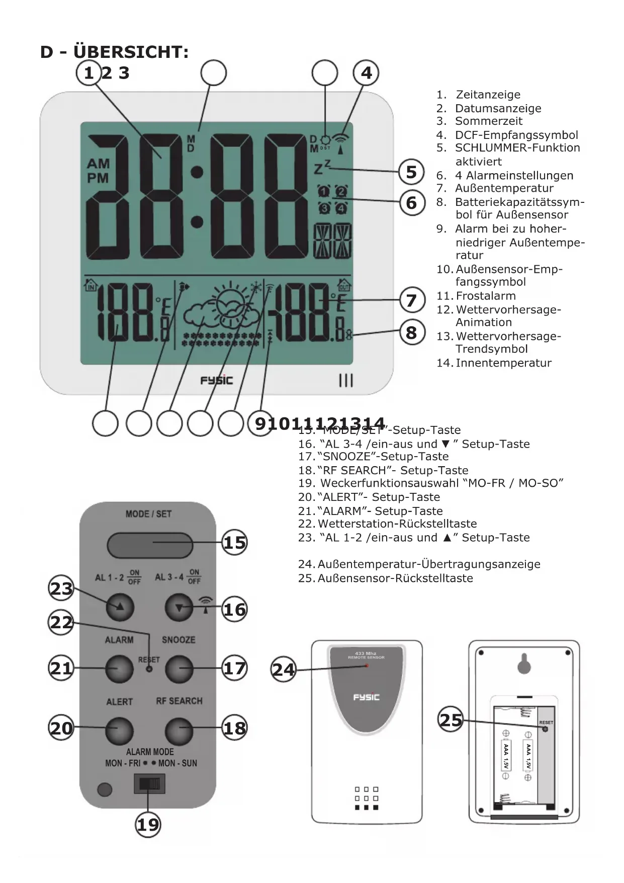 MON - SUNTemperaturalarm einstellen: Drücken Sie für die folgende Auswahl die “ALERT”-Taste (20): Hohe Alarmstufe aktiv (Einstellung von -49°C bis +70°C) Hohe und niedrige Alarmstufe aktiv. Niedrige Alarmstufe aktiv (Einstellung von -50°C bis +6°C). Kein Alarm aktiv. Halten Sie die “ALERT”-Taste (20) für mindestens 3 Sekunden gedrückt, bis anfängt zu blinken. Mit den Tasten ▲(23) und ▼(16) stellen Sie den gewünschten Alarm bei hoher Temperatur ein. Drücken Sie die “ALERT”-Taste (20); fängt an zu blinken. Mit den Tasten ▲(23) und ▼(16) stellen Sie den gewünschten Alarm bei niedriger Temperatur ein. Drücken Sie die „ALERT“ (20) Taste erfassen alles. Sobald der Temperaturalarm erreicht ist, fängt das Symbol mit der Temperatur an zu blinken ( oder ), während ein Alarmton ausgegeben wird. Drücken Sie eine beliebige Taste oder warten Sie 2 Minuten, um den Alarmton zu stoppen. Solange die Temperatur zu hoch oder zu niedrig bleibt, blinkt die Temperaturanzeige weiter. Sobald die Temperatur unter die Grenzwerte fällt, hört die Temperaturanzeige auf zu blinken. Batteriestandanzeige: Wenn die Batterien fast erschöpft sind, erscheint die Batteriestandanzeitge. In diesem Fall wech- seln Sie bitte die Batterien der Außeneinheit. BETRIEB DER WETTERSTATION: Bei normalem Betrieb werden folgende Daten angezeigt: Uhr Innen- und Außentemperatur Animation der Wettervorhersage Trendanzeige DCF-Zeitanzeige alle aktiven Alarme Uhrenanzeige: Drücken Sie für folgende Anzeige wiederholt die “MODUS/EINSTELLEN”-Taste (15): Uhr Uhr + Tag Datum + Tag Jahr + Tag Barometertrendanzeige: Der Luftdruck ist im Vergleich zu vorher höher Der Luftdruck bleibt wie vorher gleich Der Luftdruck ist im Vergleich zu vorher niedriger Wetterlage: Wenn die Wetteranimation Regen anzeigt, aber eine der Temperaturanzeigen unter 0°C liegt, zeigt die Animation Schnee an. Frostalarm: Das Symbol Frostalarm erscheint am Display, wenn die Außentemperatur zwischen -2°C und +3°C liegt. Den Außensensor manuell suchen: Halten Sie die “RF SUCHE”-Taste (15) für mindestens 2 Sekunden gedrückt, bis der Wert des Au- ßensensors anfängt zu blinken. Die Wetterstation sucht jetzt erneut den Außensensor. D S TDCF manuell suchen: Halten Sie die Taste “AL-3 - 4 ” für mindestens 2 Sekunden gedrückt, bis das DCF-Zeitsymbol anfängt zu blinken. Die Wetterstation versucht jetzt erneut, das DCF-Signal zu empfangen. Täglich um 3:00 versucht die Wetterstation automatisch die Synchronisation mit der DCF-77 Station. RESET / SYSTEMFEHLER: Falls Sie die Übersicht über die Einstellungen oder die Wetterstation verloren haben, zeigt die Wetterstation einen möglichen Fehler an, es wird empfohlen, die Wetterstation und den Außensensor zurückzustellen. Für weitere Informationen besuchen Sie www.fysic.com AUFSTELLTIPPS: