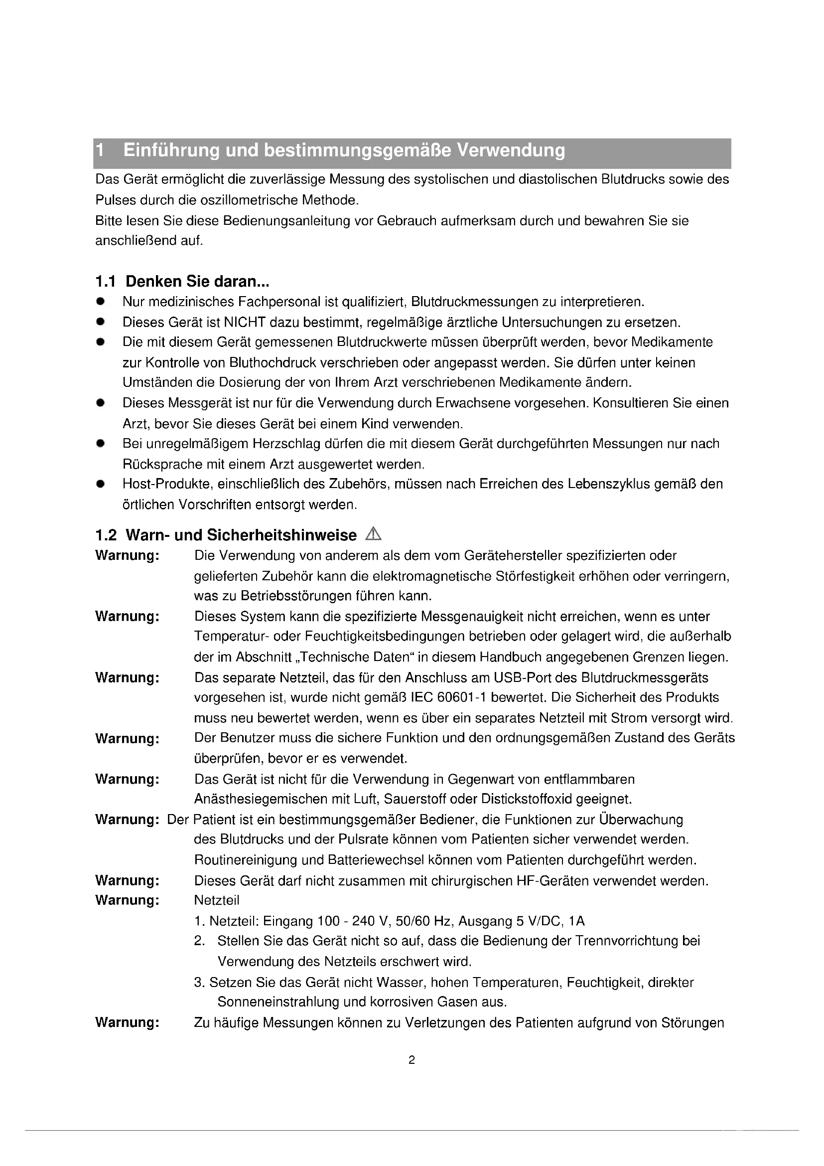 Warnung: Die Verwendung von anderem als dem vom Gerätehersteller spezifizierten oder gelieferten Zubehör kann die elektromagnetische Störfestigkeit erhöhen oder verringern, was zu Betriebsstörungen führen kann. Warnung: Dieses System kann die spezifizierte Messgenauigkeit nicht erreichen, wenn es unter Temperatur- oder Feuchtigkeitsbedingungen betrieben oder gelagert wird, die außerhalb der im Abschnitt „Technische Daten“ in diesem Handbuch angegebenen Grenzen liegen. Warnung: Das separate Netzteil, das für den Anschluss am USB-Port des Blutdruckmessgeräts vorgesehen ist, wurde nicht gemäß IEC 60601-1 bewertet. Die Sicherheit des Produkts muss neu bewertet werden, wenn es über ein separates Netzteil mit Strom versorgt wird. War nung: Der Benutzer muss die sichere Funktion und den ordnungsgemäßen Zustand des Geräts überprüfen, bevor er es verwendet. Warnung: Das Gerät ist nicht für die Verwendung in Gegenwart von entflammbaren Anästhesiegemischen mit Luft, Sauerstoff oder Distickstoffoxid geeignet. Warnung: Der Patient ist ein bestimmungsgemäßer Bediener, die Funktionen zur Überwachung des Blutdrucks und der Pulsrate können vom Patienten sicher verwendet werden. Routinereinigung und Batteriewechsel können vom Patienten durchgeführt werden. Warnung: Dieses Gerät darf nicht zusammen mit chirurgischen HF-Geräten verwendet werden. Warnung: Netzteil