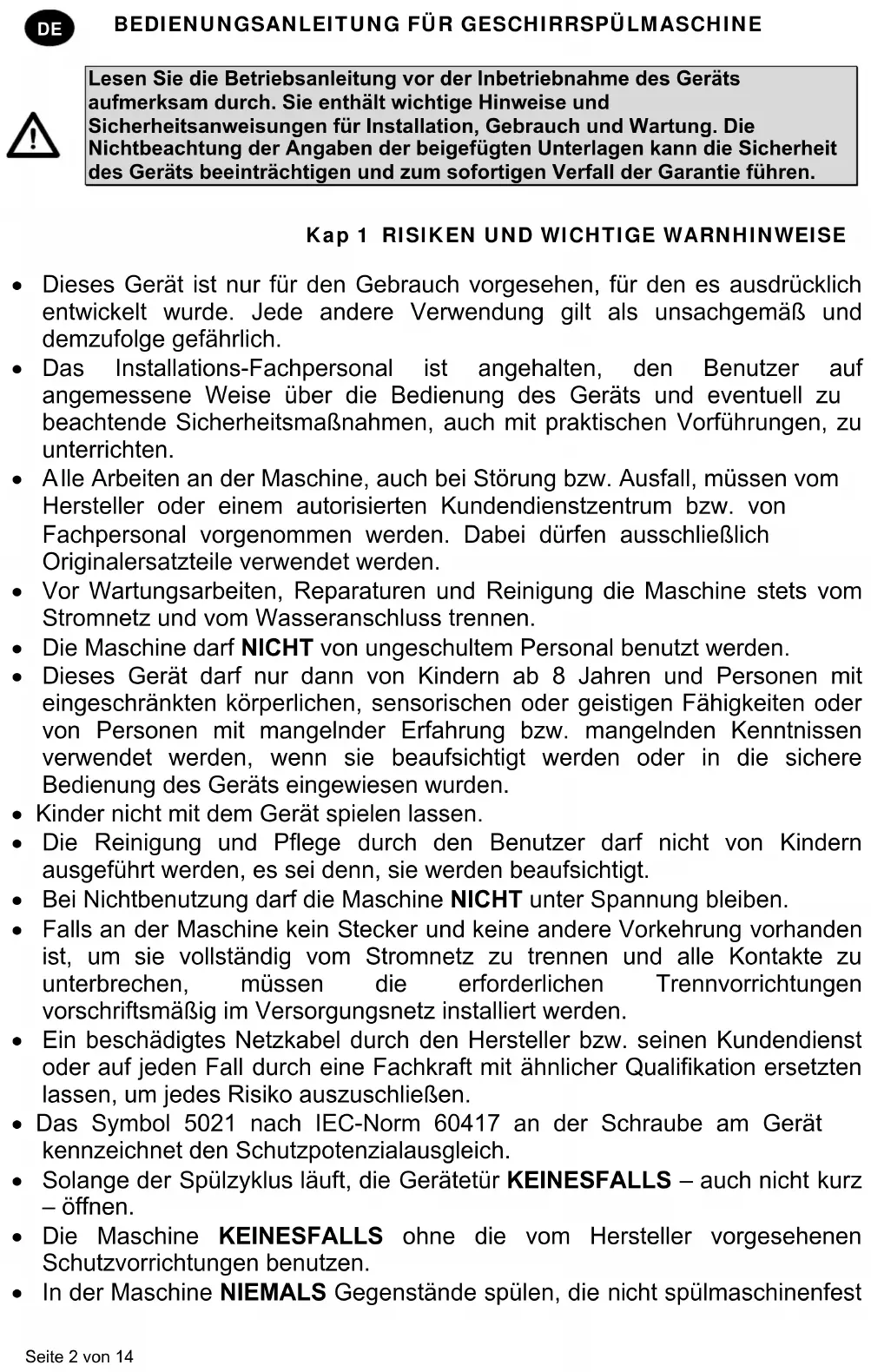 lle Arbeiten an der Maschine, auch bei Störung bzw. Ausfall, müssen vom Hersteller oder einem autorisierten Kundendienstzentrum bzw. von Fachpersonal vorgenommen werden. Dabei dürfen ausschließlich Originalersatzteile verwendet werden. Vor Wartungsarbeiten, Reparaturen und Reinigung die Maschine stets vom Stromnetz und vom Wasseranschluss trennen. Die Maschine darf NICHT von ungeschultem Personal benutzt werden. Dieses Gerät darf nur dann von Kindern ab 8 Jahren und Personen mit eingeschränkten körperlichen, sensorischen oder geistigen Fähigkeiten oder von Personen mit mangelnder Erfahrung bzw. mangelnden Kenntnissen verwendet werden, wenn sie beaufsichtigt werden oder in die sichere Bedienung des Geräts eingewiesen wurden. Kinder nicht mit dem Gerät spielen lassen. Die Reinigung und Pflege durch den Benutzer darf nicht von Kindern ausgeführt werden, es sei denn, sie werden beaufsichtigt. Bei Nichtbenutzung darf die Maschine NICHT unter Spannung bleiben. Falls an der Maschine kein Stecker und keine andere Vorkehrung vorhanden ist, um sie vollständig vom Stromnetz zu trennen und alle Kontakte zu unterbrechen, müssen die erforderlichen Trennvorrichtungen vorschriftsmäßig im Versorgungsnetz installiert werden. Ein beschädigtes Netzkabel durch den Hersteller bzw. seinen Kundendienst oder auf jeden Fall durch eine Fachkraft mit ähnlicher Qualifikation ersetzten lassen, um jedes Risiko auszuschließen. Das Symbol 5021 nach IEC-Norm 60417 an der Schraube am Gerät kennzeichnet den Schutzpotenzialausgleich. Solange der Spülzyklus läuft, die Gerätetür KEINESFALLS – auch nicht kurz – öffnen. Die Maschine KEINESFALLS ohne die vom Hersteller vorgesehenen Schutzvorrichtungen benutzen. In der Maschine NIEMALS Gegenstände spülen, die nicht spülmaschinenfestBEDIENUNGSANLEITUNG FÜR GESCHIRRSPÜLMASCHINE Seite 3 von 14