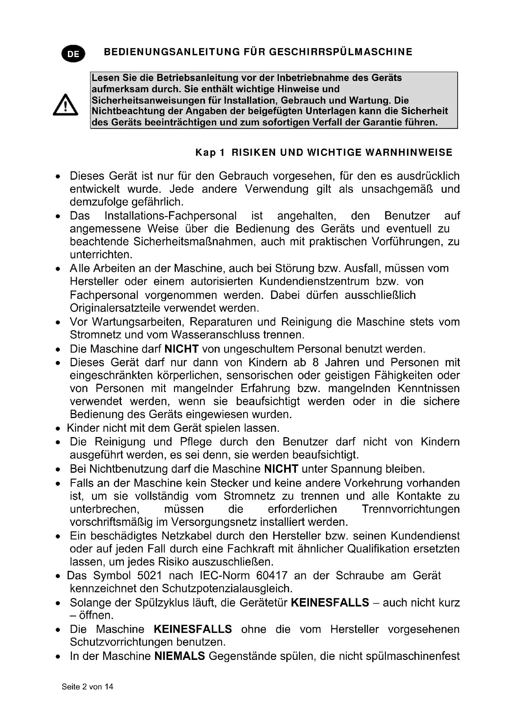 lle Arbeiten an der Maschine, auch bei Störung bzw. Ausfall, müssen vom Hersteller oder einem autorisierten Kundendienstzentrum bzw. von Fachpersonal vorgenommen werden. Dabei dürfen ausschließlich Originalersatzteile verwendet werden. Vor Wartungsarbeiten, Reparaturen und Reinigung die Maschine stets vom Stromnetz und vom Wasseranschluss trennen. Die Maschine darf NICHT von ungeschultem Personal benutzt werden. Dieses Gerät darf nur dann von Kindern ab 8 Jahren und Personen mit eingeschränkten körperlichen, sensorischen oder geistigen Fähigkeiten oder von Personen mit mangelnder Erfahrung bzw. mangelnden Kenntnissen verwendet werden, wenn sie beaufsichtigt werden oder in die sichere Bedienung des Geräts eingewiesen wurden. Kinder nicht mit dem Gerät spielen lassen. Die Reinigung und Pflege durch den Benutzer darf nicht von Kindern ausgeführt werden, es sei denn, sie werden beaufsichtigt. Bei Nichtbenutzung darf die Maschine NICHT unter Spannung bleiben. Falls an der Maschine kein Stecker und keine andere Vorkehrung vorhanden ist, um sie vollständig vom Stromnetz zu trennen und alle Kontakte zu unterbrechen, müssen die erforderlichen Trennvorrichtungen vorschriftsmäßig im Versorgungsnetz installiert werden. Ein beschädigtes Netzkabel durch den Hersteller bzw. seinen Kundendienst oder auf jeden Fall durch eine Fachkraft mit ähnlicher Qualifikation ersetzten lassen, um jedes Risiko auszuschließen. Das Symbol 5021 nach IEC-Norm 60417 an der Schraube am Gerät kennzeichnet den Schutzpotenzialausgleich. Solange der Spülzyklus läuft, die Gerätetür KEINESFALLS – auch nicht kurz – öffnen. Die Maschine KEINESFALLS ohne die vom Hersteller vorgesehenen Schutzvorrichtungen benutzen. In der Maschine NIEMALS Gegenstände spülen, die nicht spülmaschinenfestBEDIENUNGSANLEITUNG FÜR GESCHIRRSPÜLMASCHINE Seite 3 von 14
